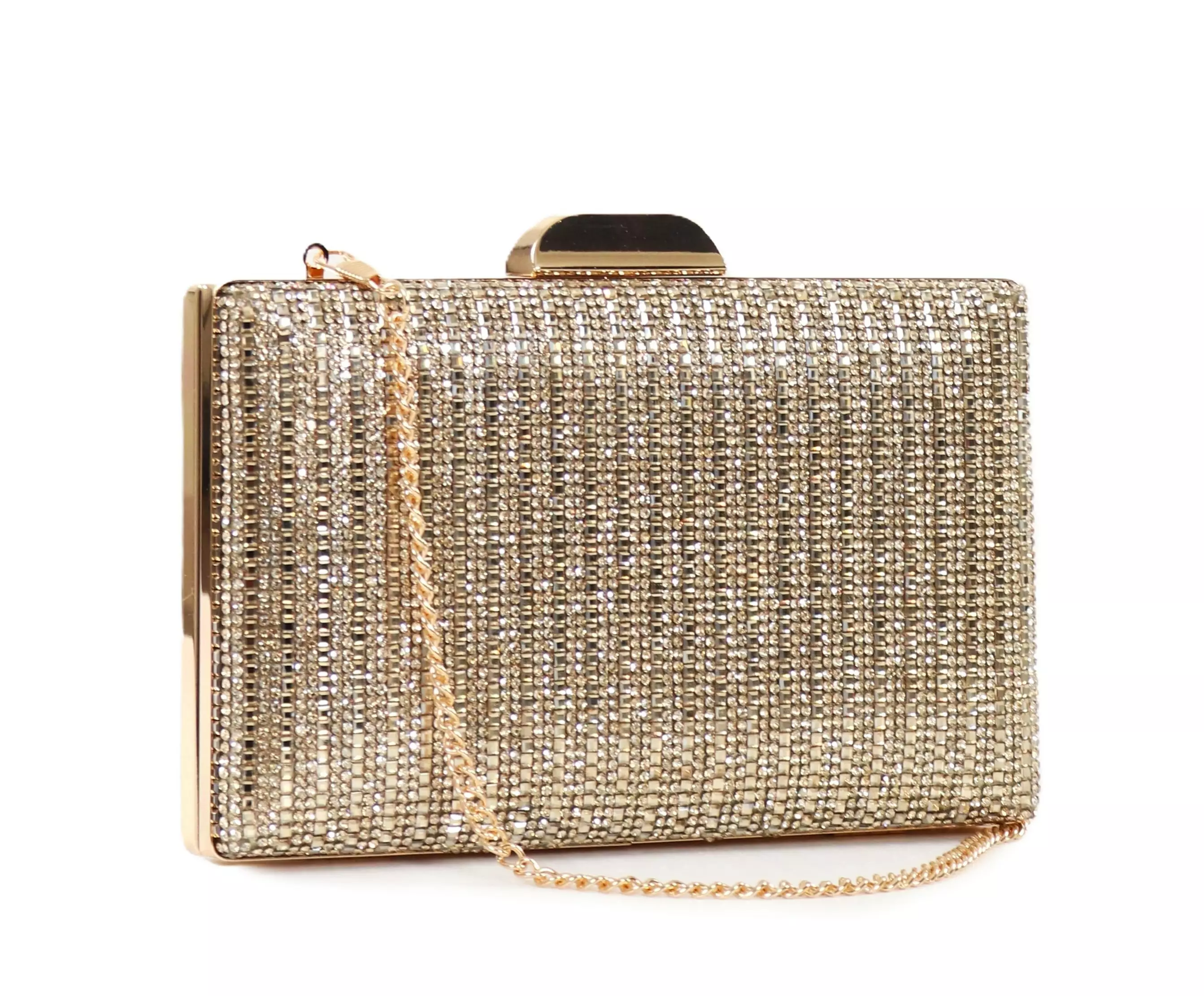 Kaunis kultainen juhlalaukku/iltalaukku, jota voidaan käyttää clutchin tapaan tai olkalaukkuna.