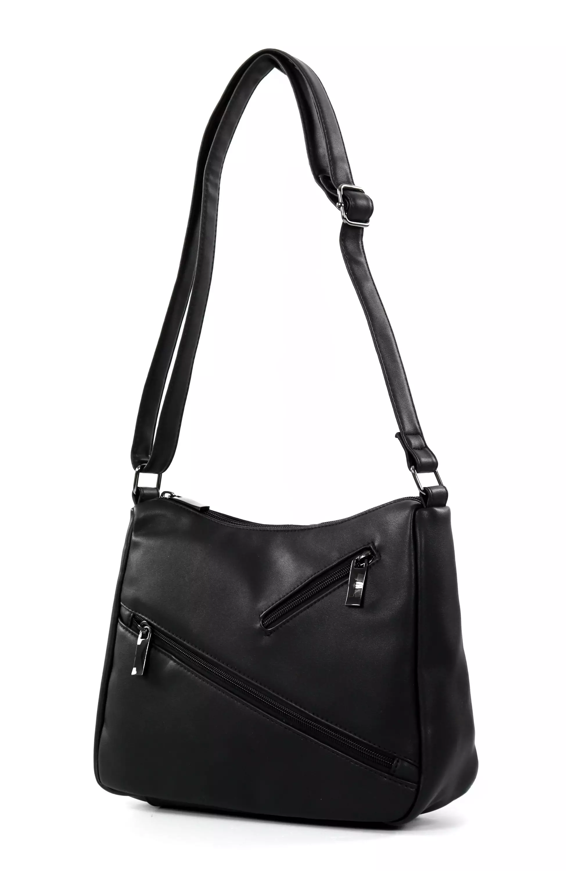 Kierrätysmateriaaleista valmistettu olkalaukku useilla vetoketjutaskuilla.