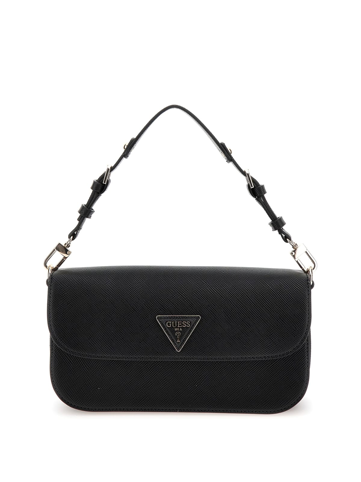 Guessin trendikäs musta olkalaukku, jossa mukana kaksi eri mittaista hihnaa.