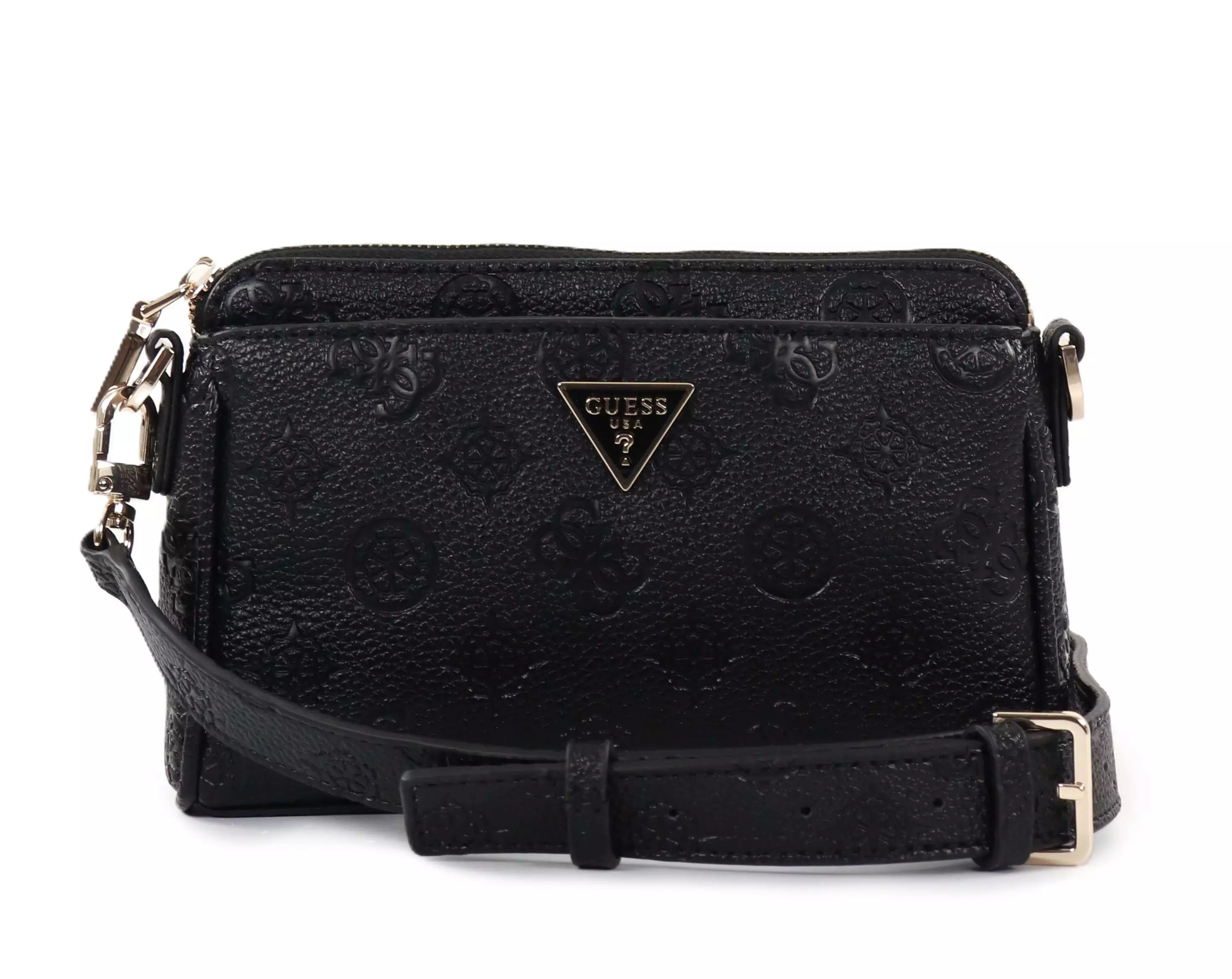 Tyylikäs Guess-olkalaukku, jossa on kaunis kohokuviointi ja näyttävät kultaiset yksityiskohdat. Kompakti mutta käytännöllinen valinta arkeen ja juhlaan.