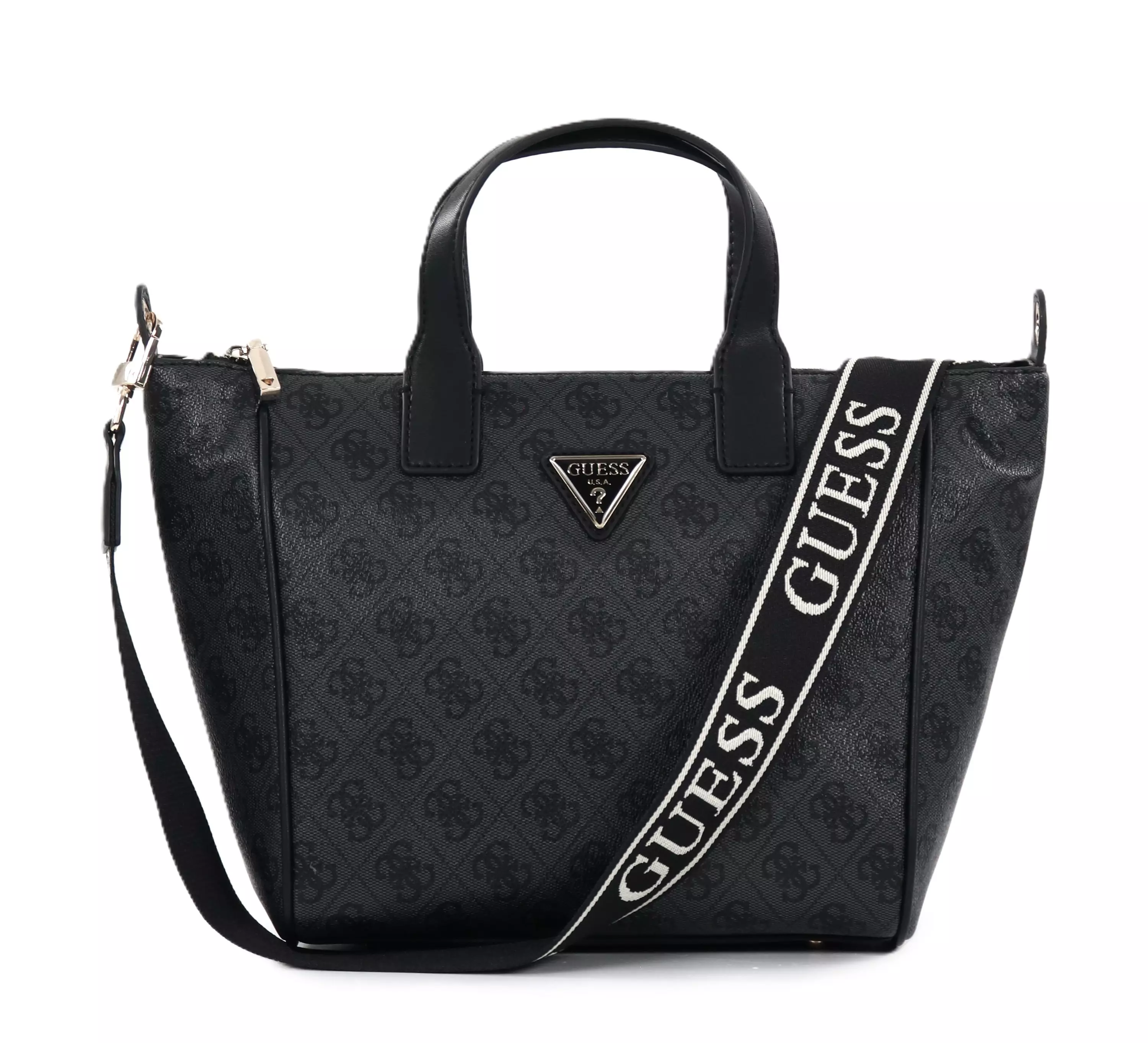 Tyylikäs Guess-olkalaukku, jossa leveä tekstiilihihna ja kantokahvat. Logokuvioitu pinta ja kultaiset yksityiskohdat tuovat ylellistä ilmettä. Käytännöllinen ja trendikäs valinta!