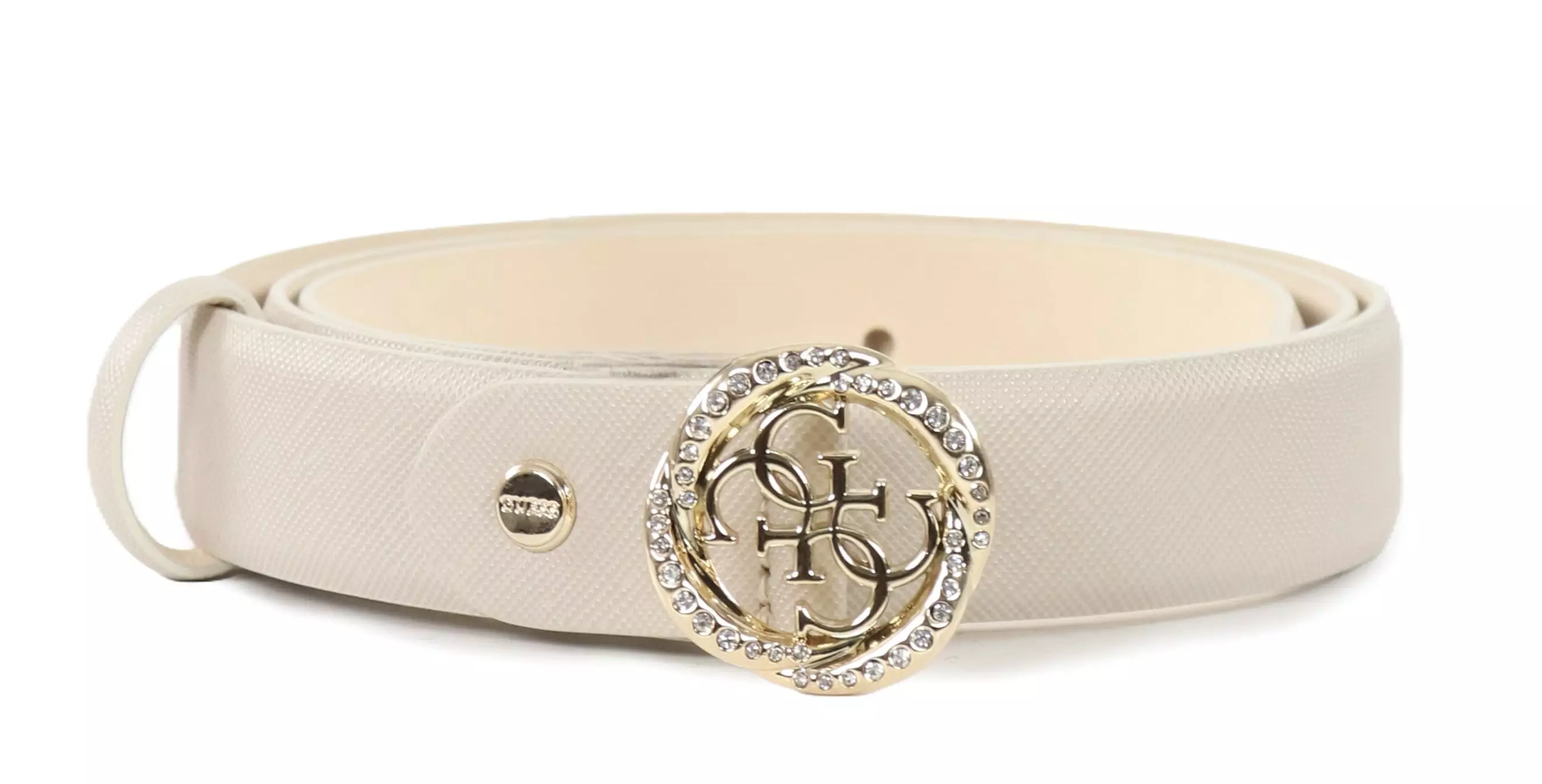 Nuden värinen Guess-vyö kultaisella soljella ja timanttiyksityiskohdilla. Hillitty ja tyylikäs asuste, joka on helppo yhdistää eri alaosiin.