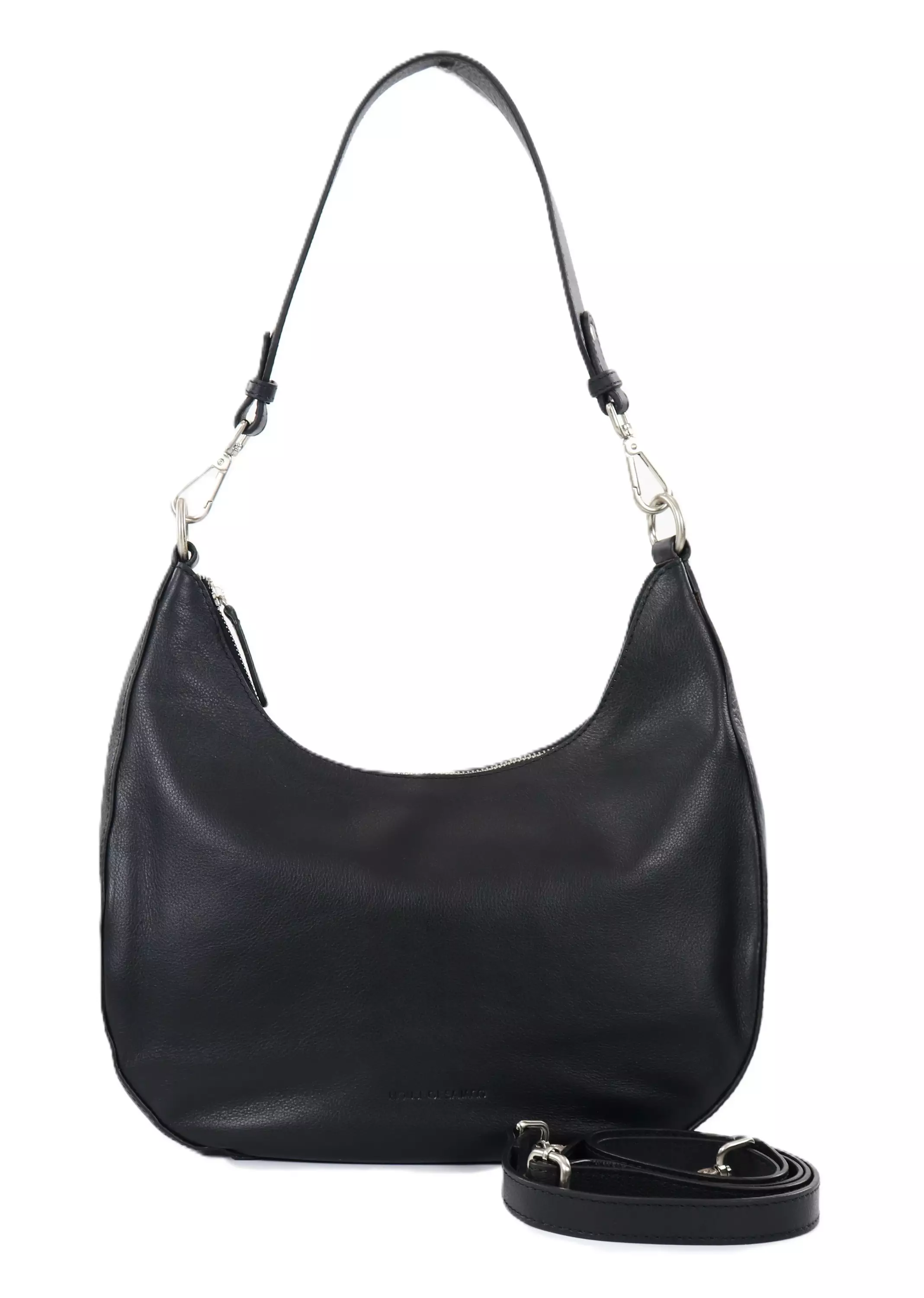 Aitonahkainen laukku säädettävällä ja irrotettavalla olkahihnalla.
