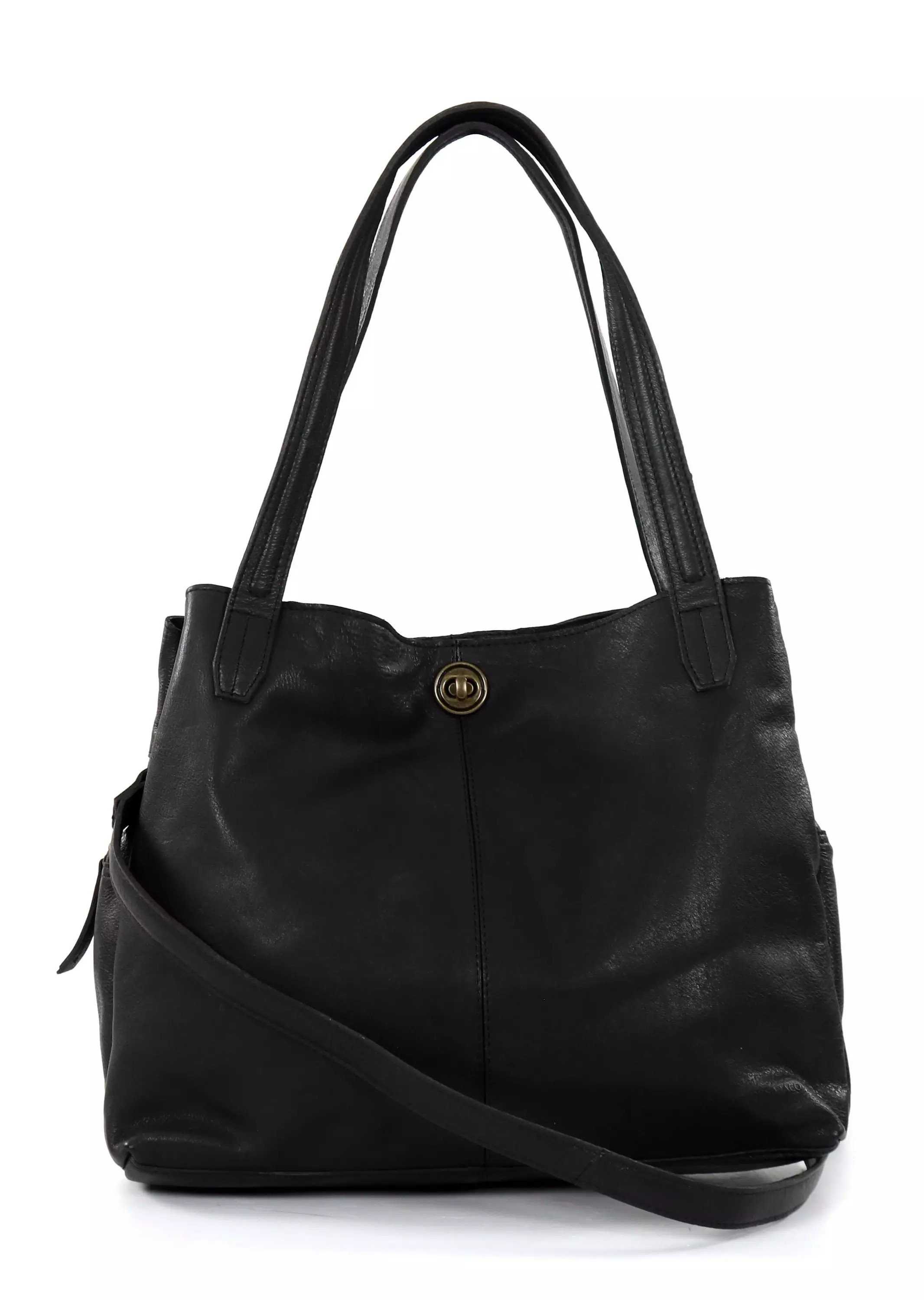 Tilava olkalaukku pehmeää nahkaa. Mukana irrotettava ja säädeltävä olkahihna.