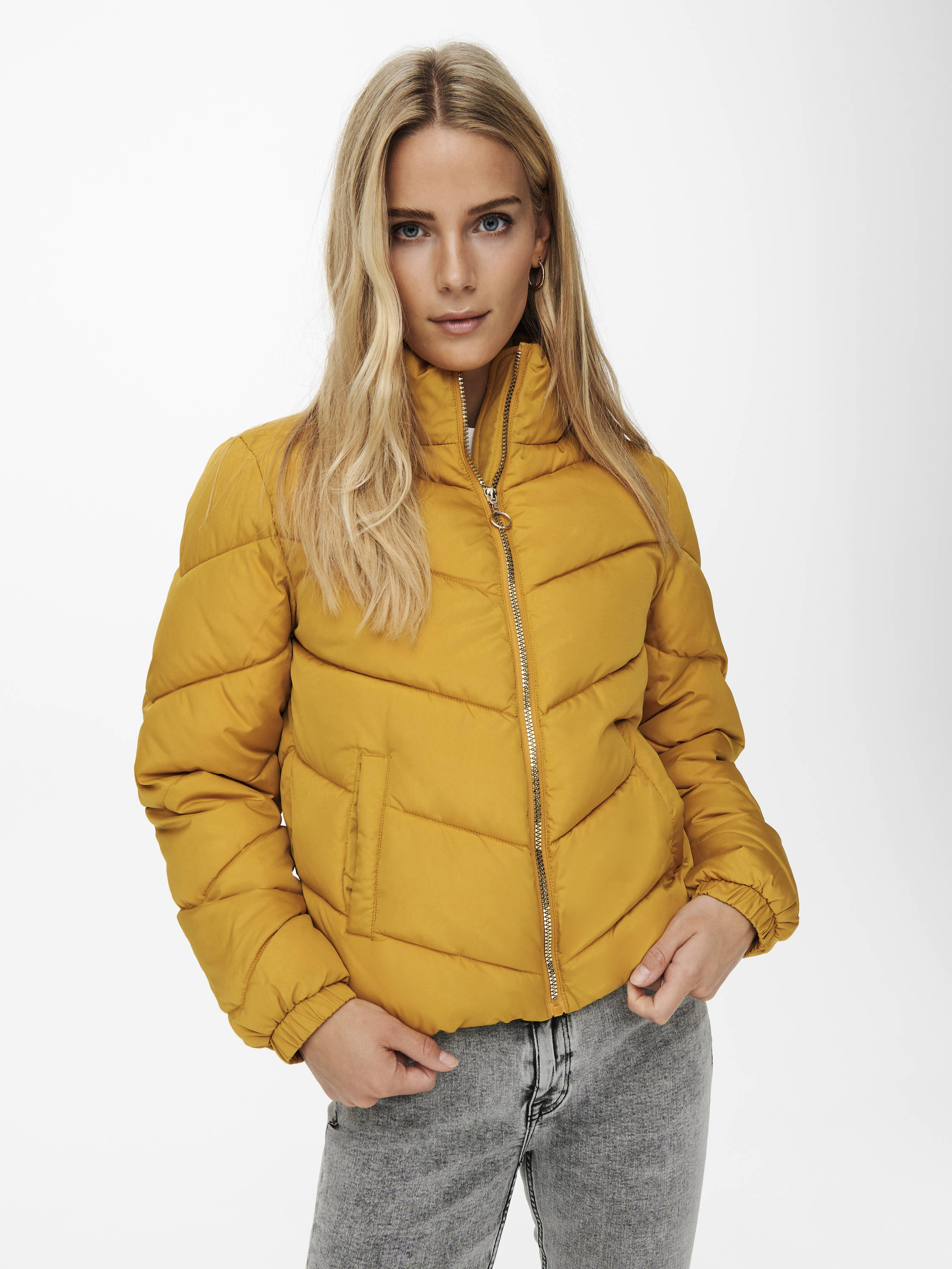 Lyhyt kevyttoppatakki kullansävyisellä vetoketjulla.