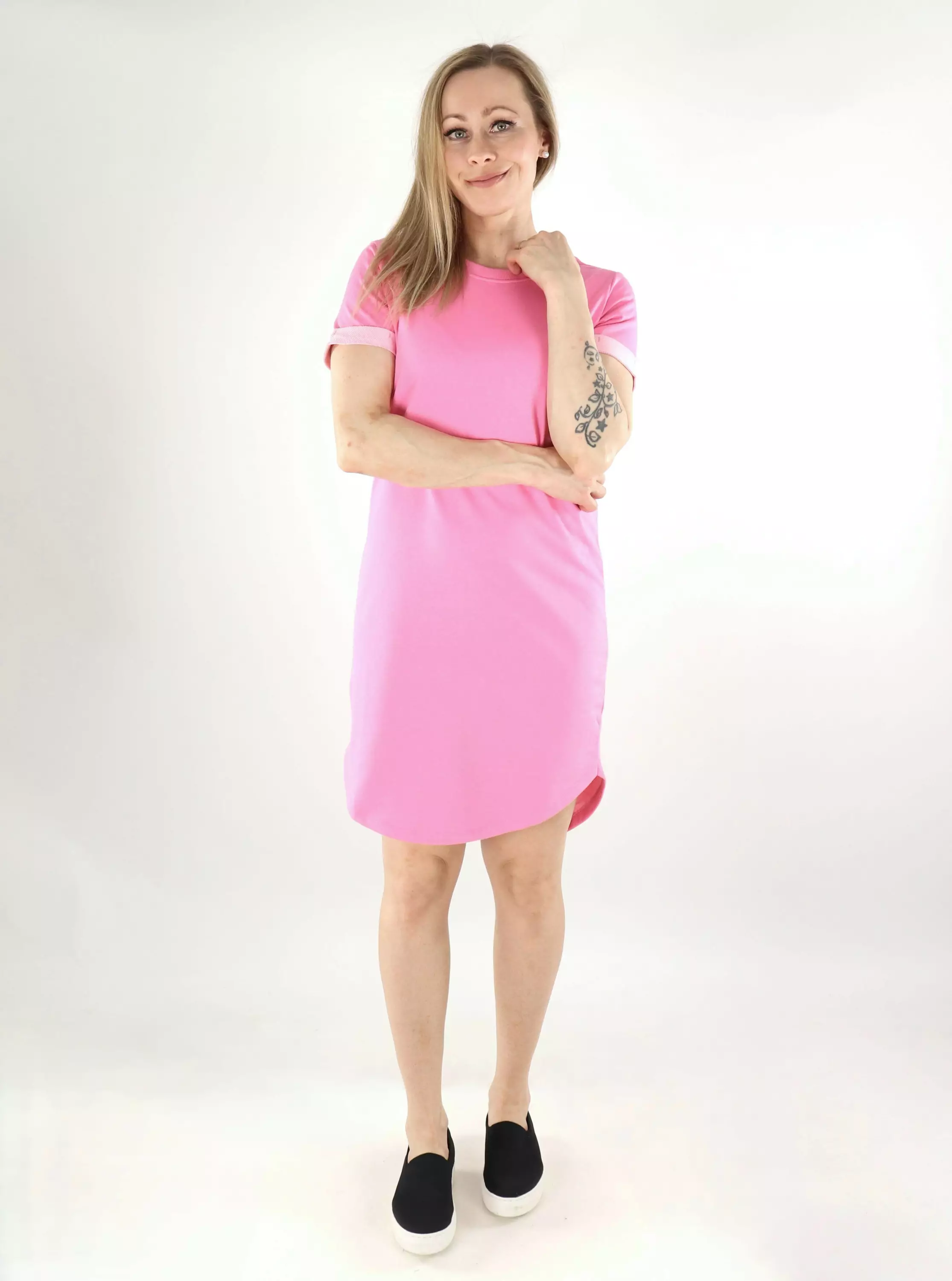 Tämä lyhythihainen pinkki collegemekko on täydellinen valinta rentoon, mutta tyylikkääseen lookkiin. Käännetyt hihansuut tuovat mekkoon raikasta ilmettä, ja pehmeä materiaali lisää käyttömukavuutta.