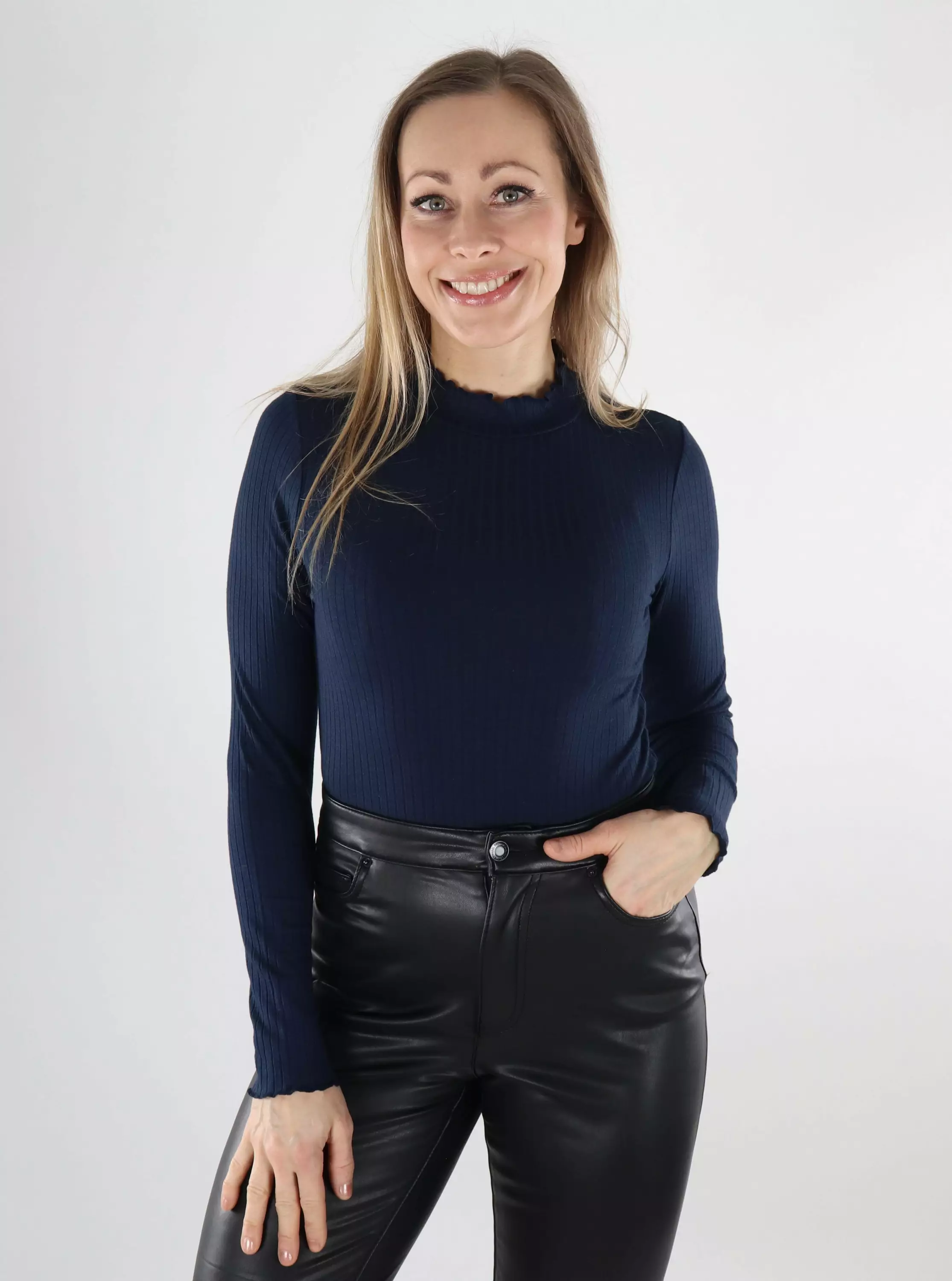 Korkealla pääntiellä varustettu ribbipaita, jonka röyhelömäiset reunat tuovat ilmeeseen keveyttä. Miellyttävä materiaali tekee siitä arjen suosikin!