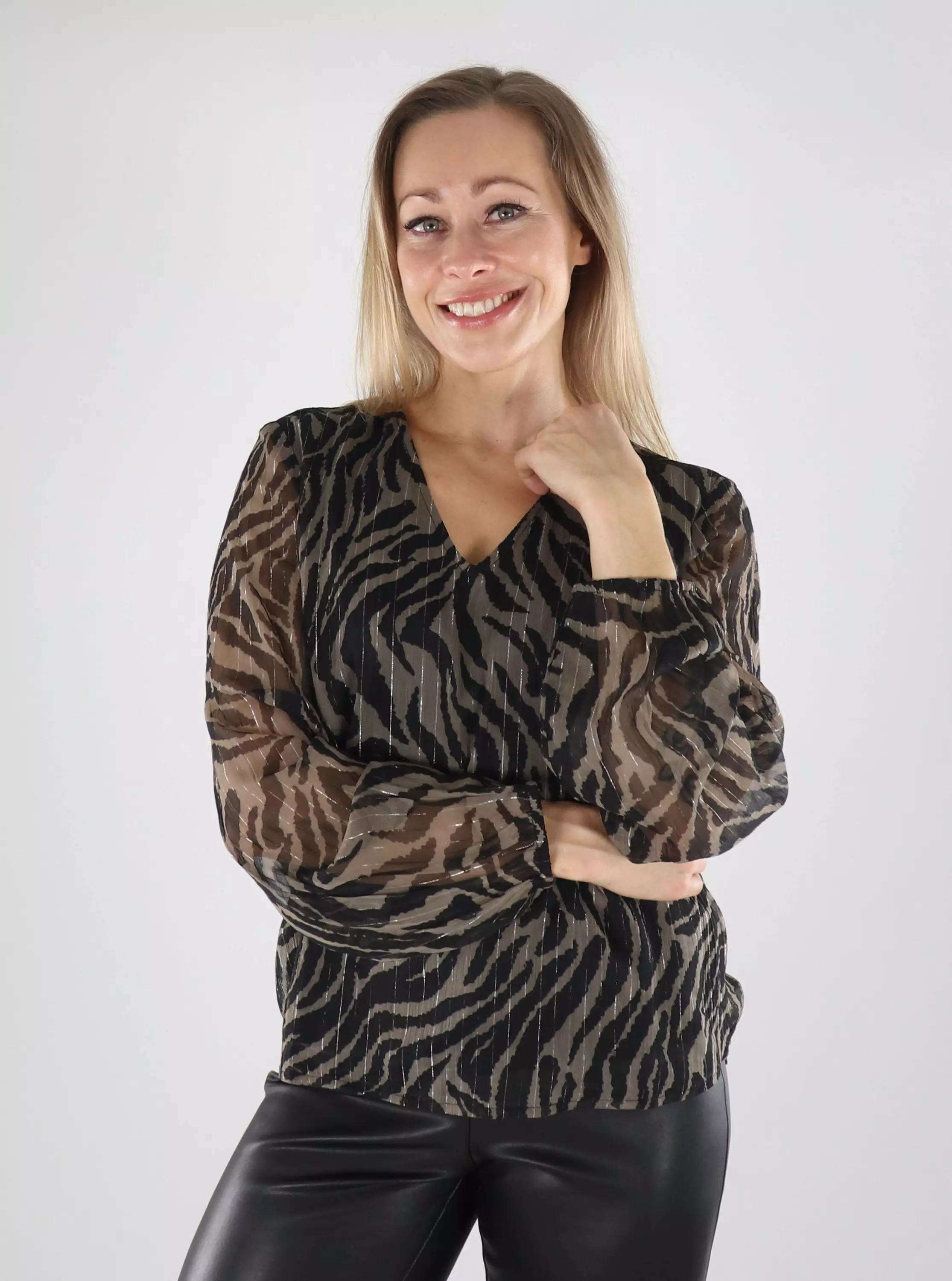Tyylikäs ja kevyt paita hopeanhohtoisilla raidoilla.