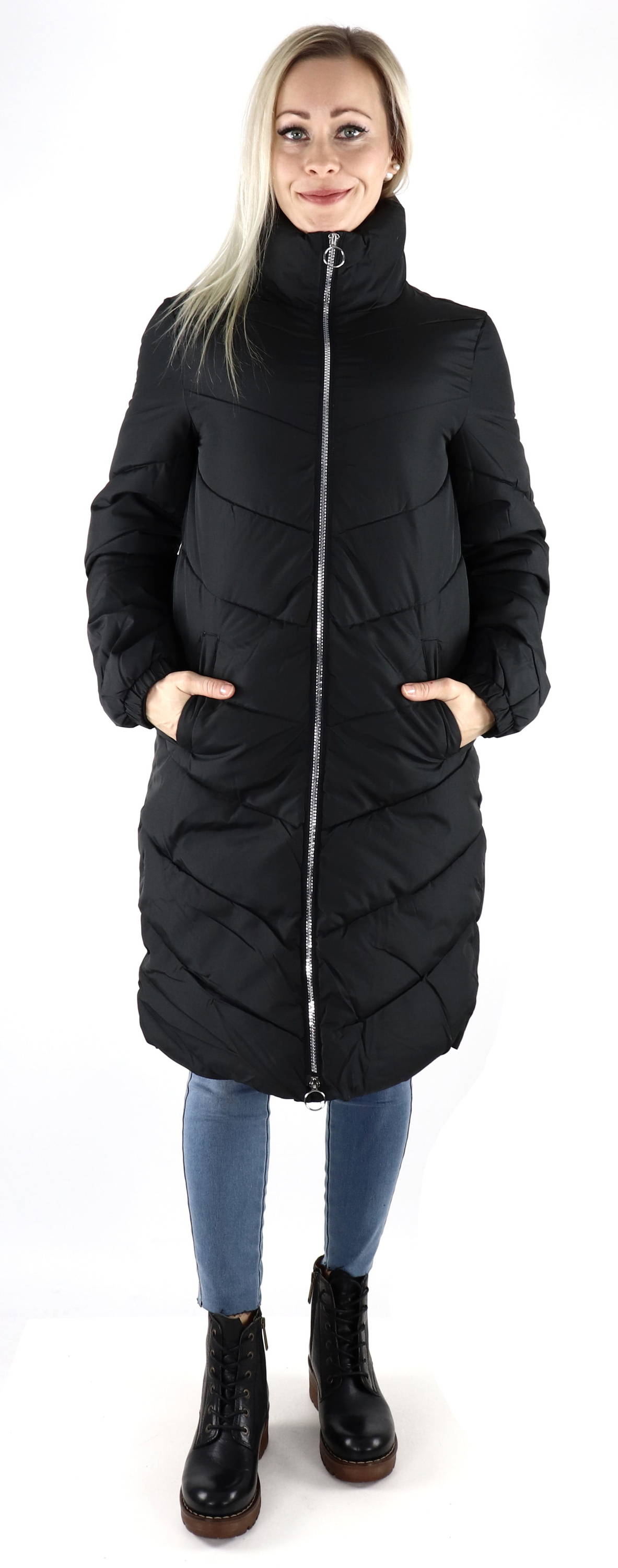 Korkeakauluksinen, pitkä kevyttoppatakki.