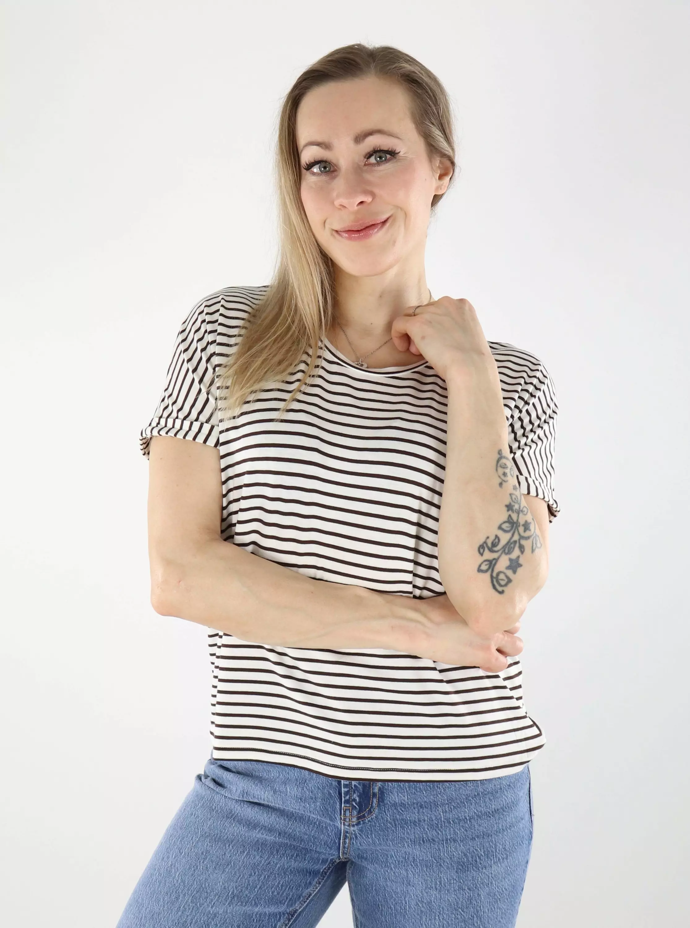 Rento ja raidallinen t-paita arkeen! Pehmeä materiaali tuntuu miellyttävältä päällä ja tekee paidasta mukavan valinnan koko päiväksi.