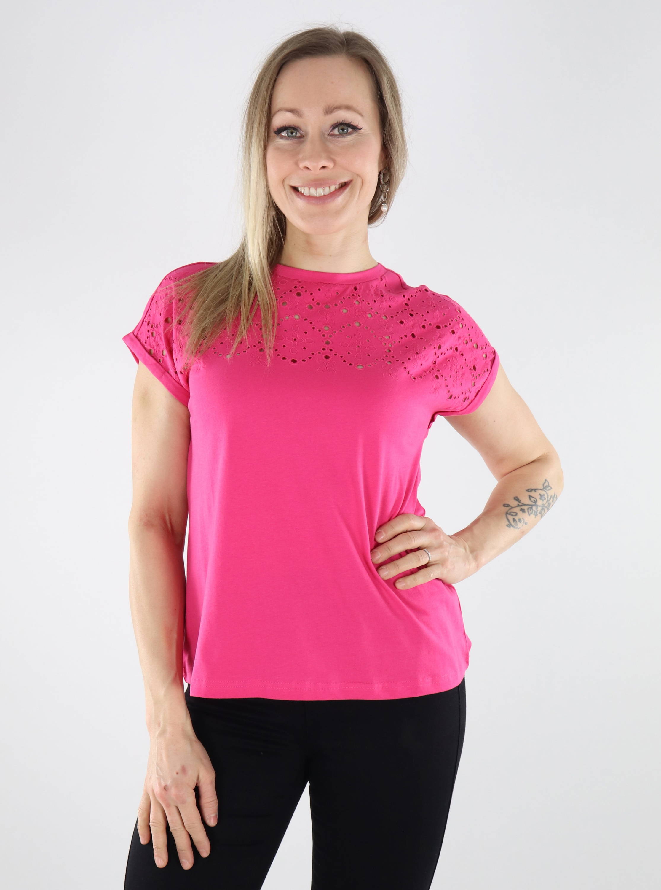 Pehmeä luomupuuvillainen t-paita, jossa pitsikuvioitu yläosa.