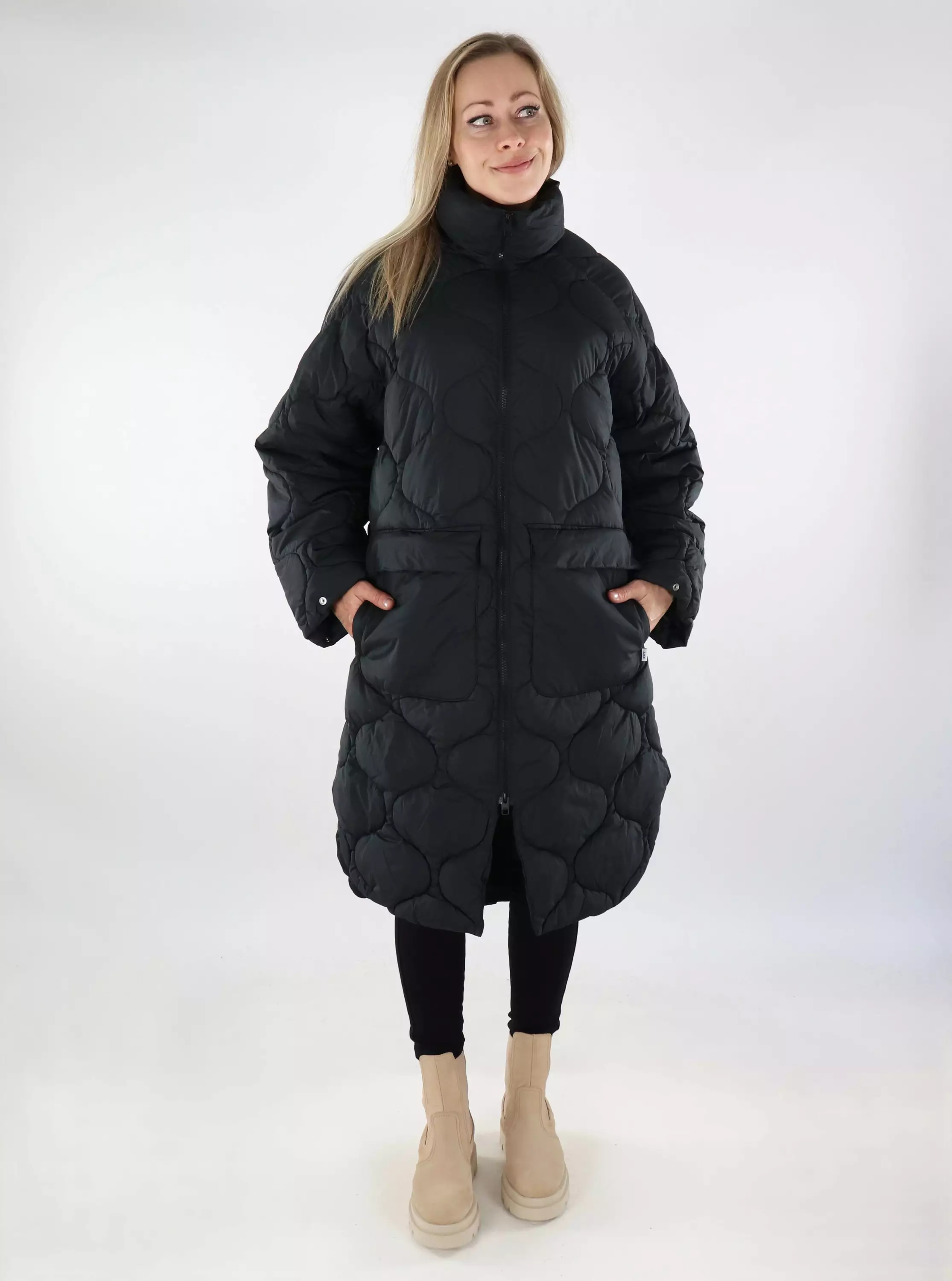 Pitkä over size-mallinen kevyttoppatakki, jossa pyöristetty helma. Tyylikäs tikattu pinta.
