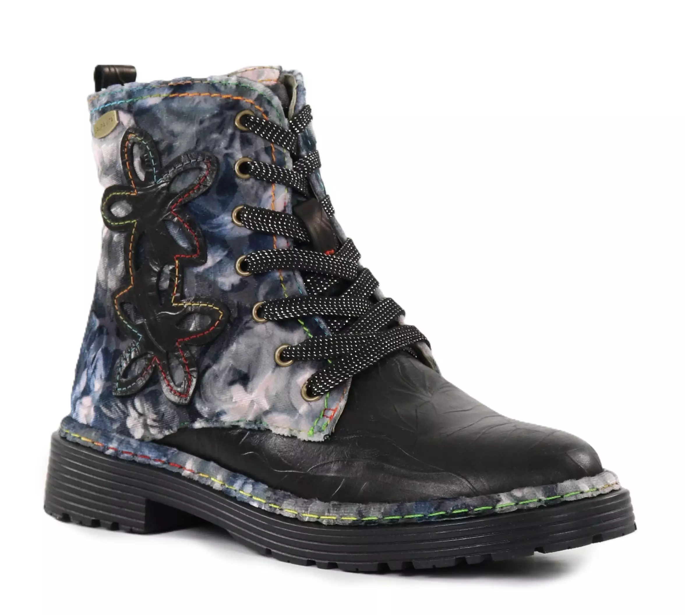 Laura Vitan maiharimalliset nilkkurit ovat täynnä yksityiskohtia, jotka tekevät vaikutuksen! Sinertävä kukkakuosi luo pehmeän ja romanttisen ilmeen, jota korostavat ulkosyrjän kukanmuotoiset koristeet. Nauhojen hopeansävyiset yksityiskohdat tuovat kokonaisuuteen ripauksen kimallusta.