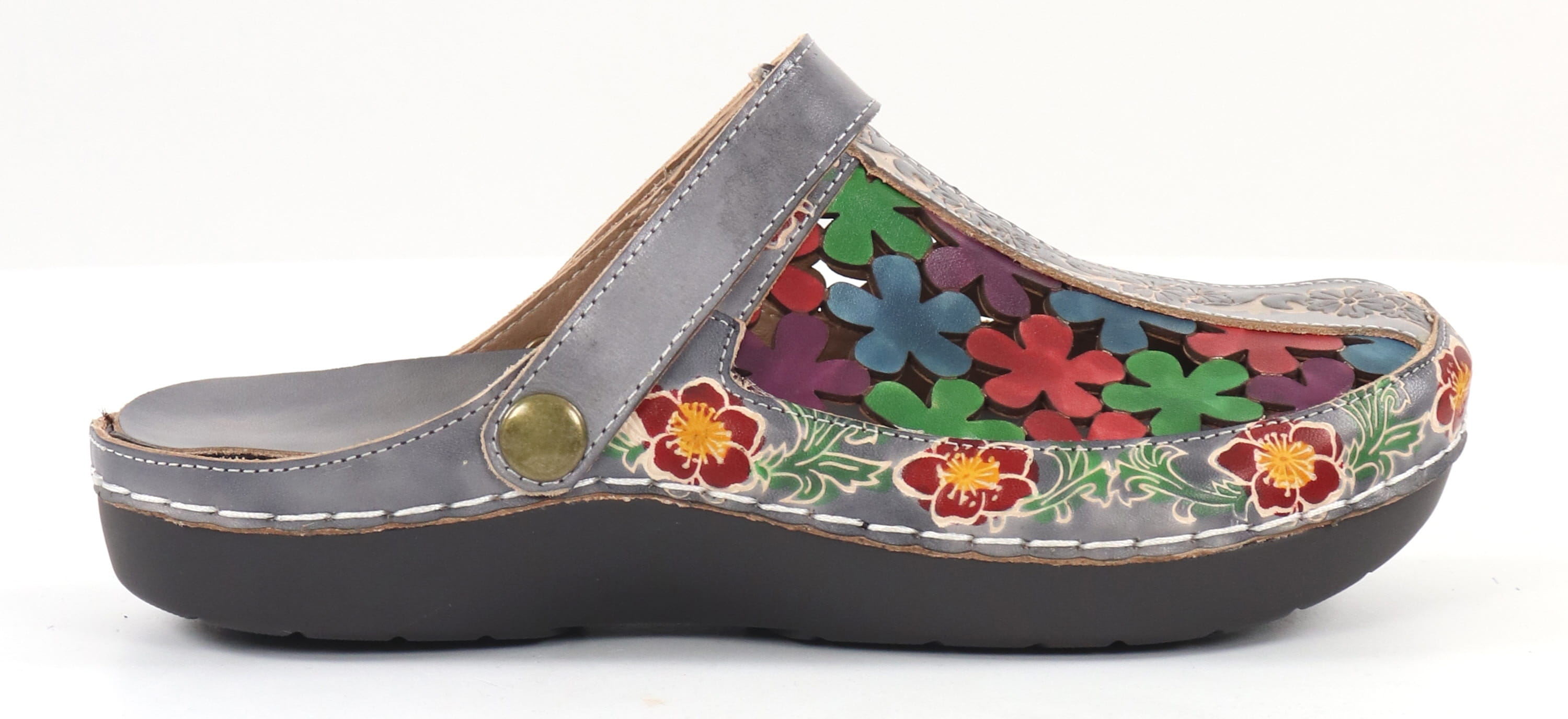 Värikkäät nahkapistokkaat kukkakuviolla, irroitettava pohjallinen ja käännettävä takaremmi.
