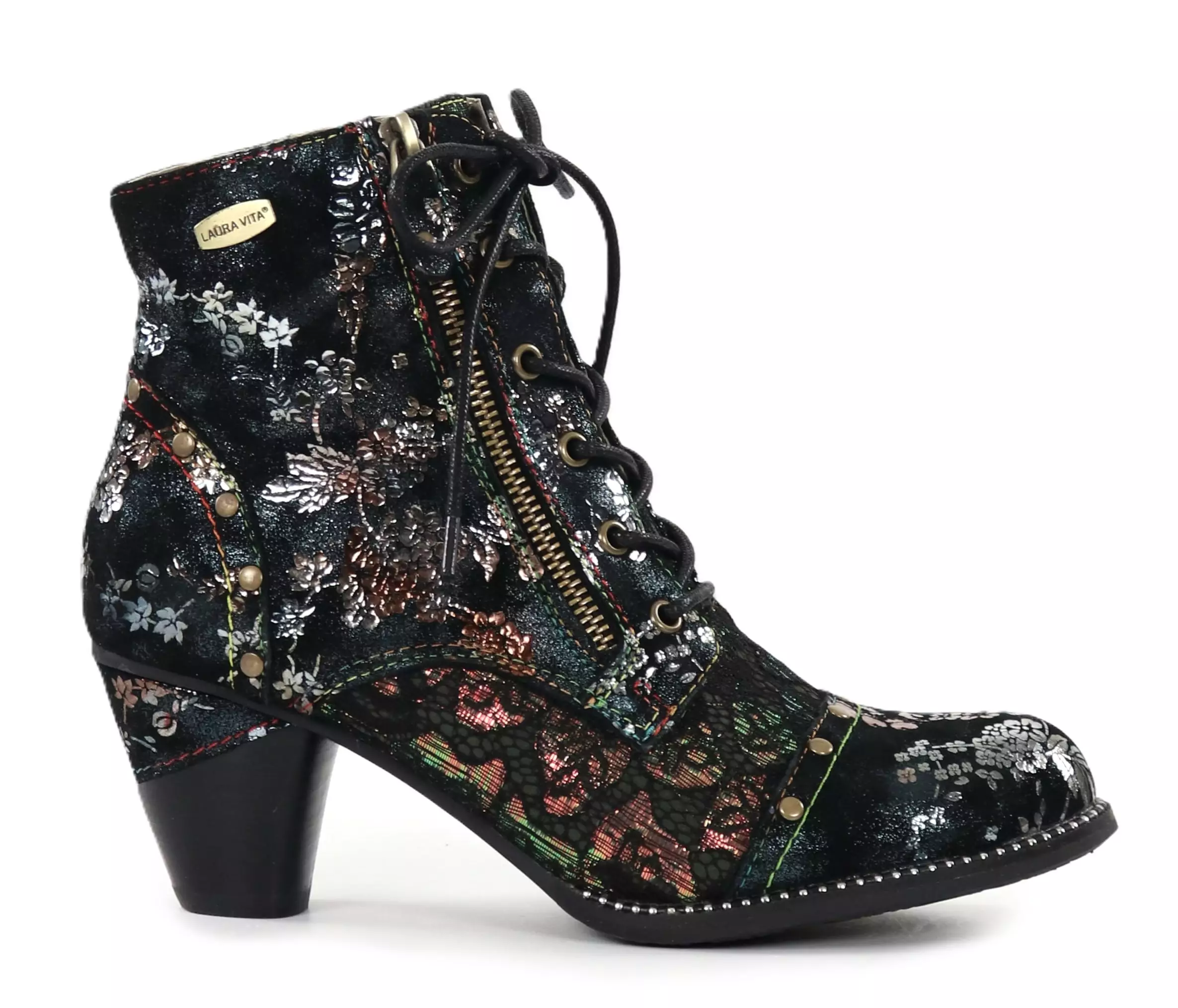 Näissä Laura Vita -nilkkureissa yhdistyvät näyttävä kuosi, tukevat tolppakorot ja huolellisesti viimeistellyt yksityiskohdat. Päällä nauhoitus tuo säädettävyyttä, sisäsyrjän vetoketju helpottaa pukemista ja ulkosyrjän koristevetoketju viimeistelee ilmeen.