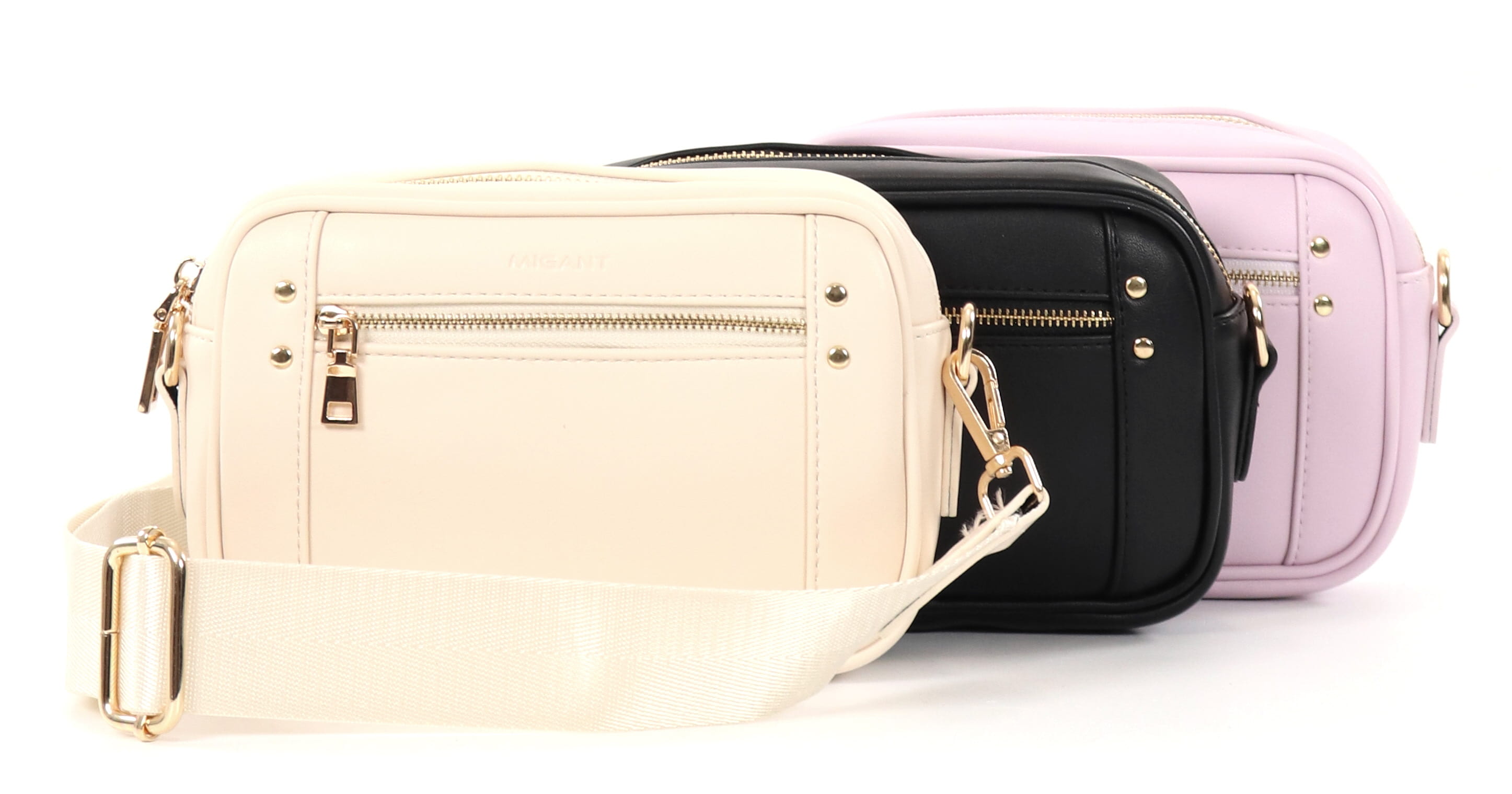 Migantin olkalaukku ohuella keinonahkaisella hihnalla sekä leveällä tekstiilihihnalla.