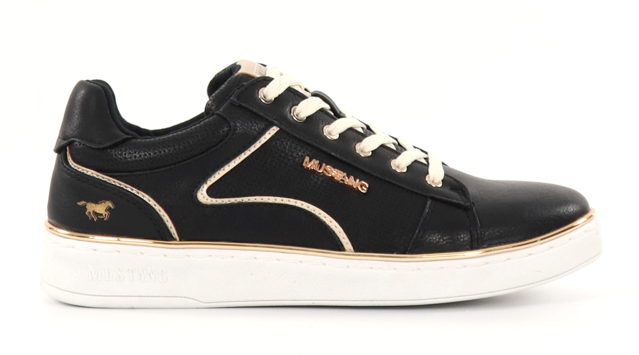 Naisten Mustang-tennarit kauniilla kultaisilla yksityiskohdilla.