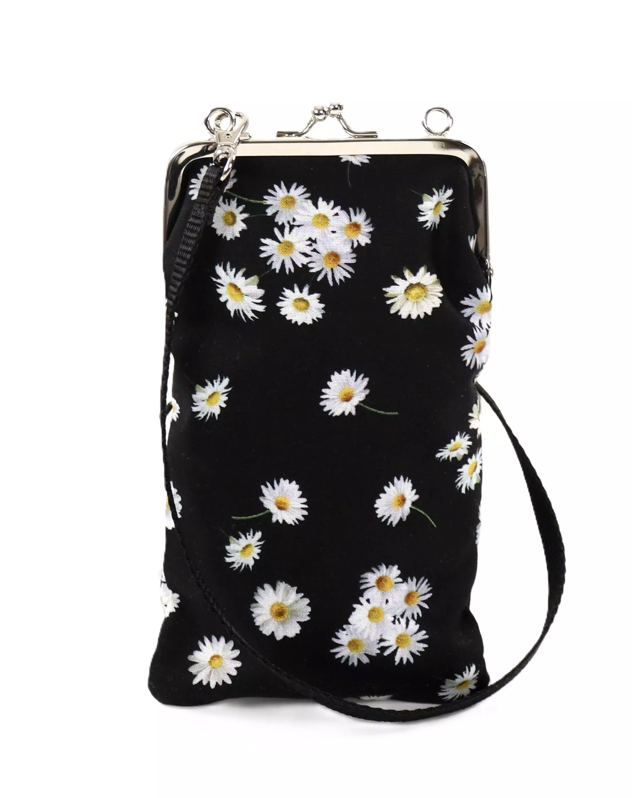 Kankainen kukkaro kuvioinnilla ja kantohihnalla. Voidaan käyttää myös puhelinpussukkana!