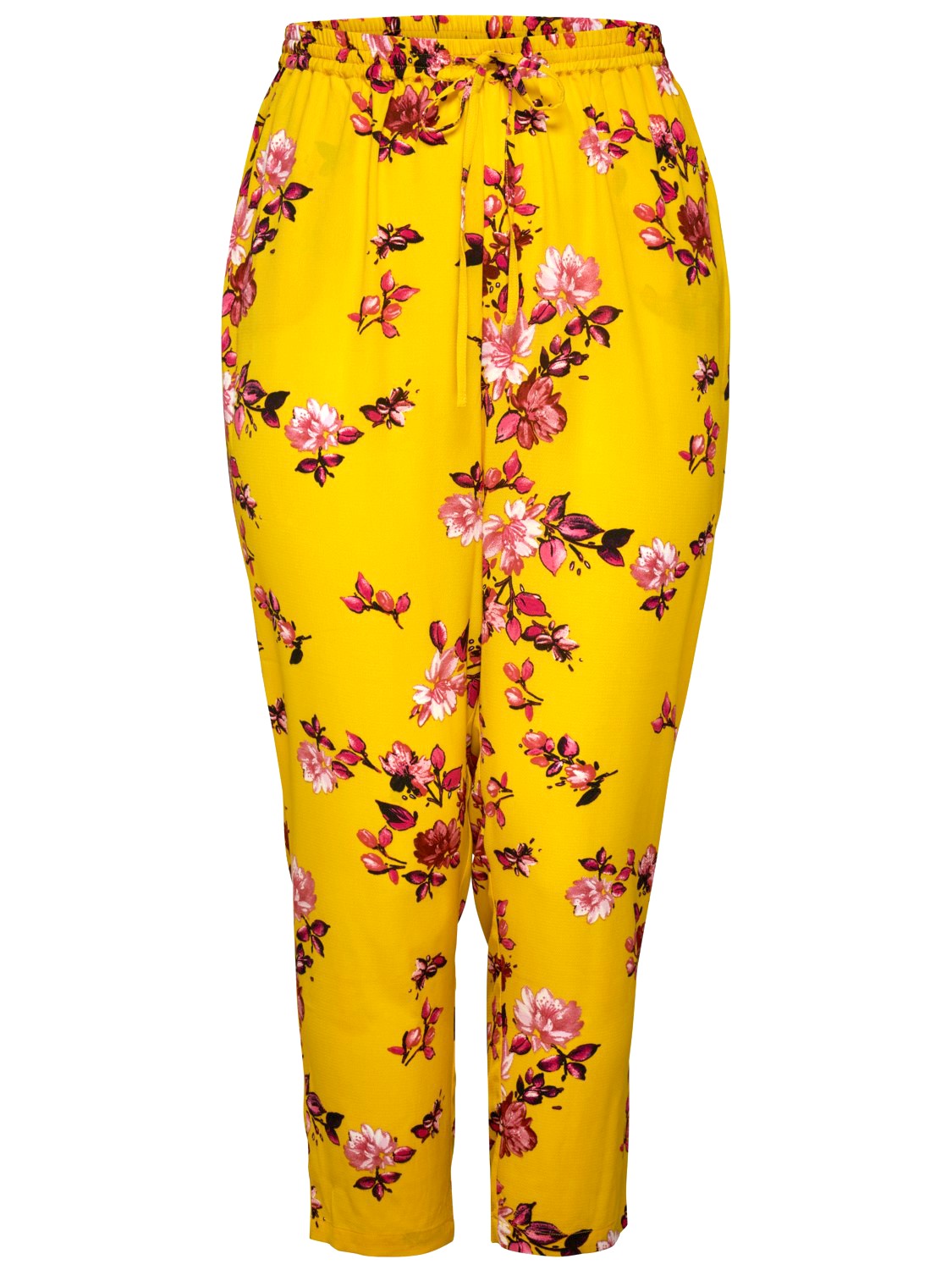 Väljät kukkakuosilliset housut kiristysnyörillä ja kuminauhalla.