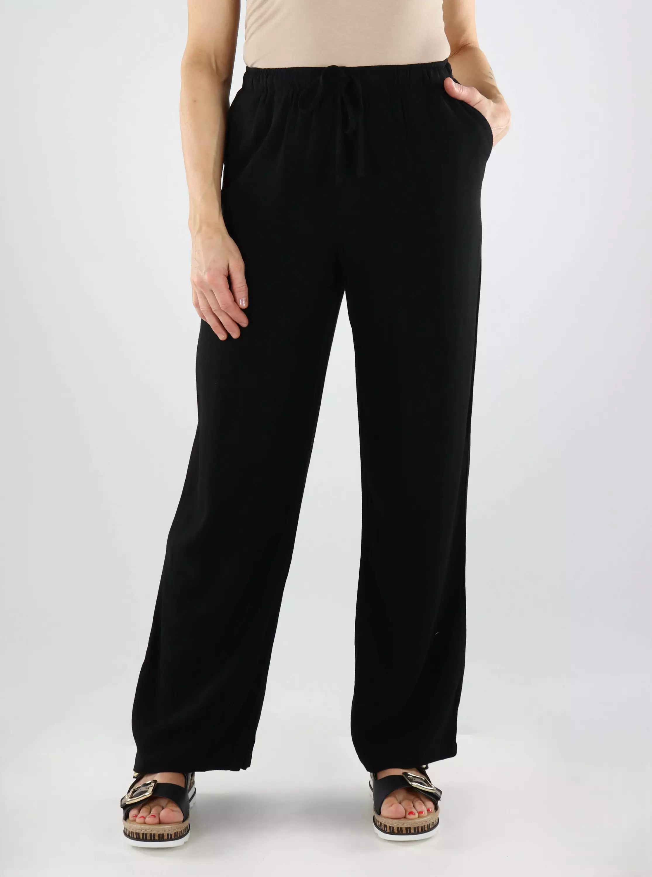 Onlyn mustat housut hurmaavat rennolla leikkauksellaan ja luonnollisen kevyellä materiaalilla. Viskoosi-pellavasekoite tekee housuista hengittävät ja miellyttävät päällä, joten ne ovat täydelliset lämpimiin päiviin. Helppo valinta rennon huoliteltuun arkilookiin!