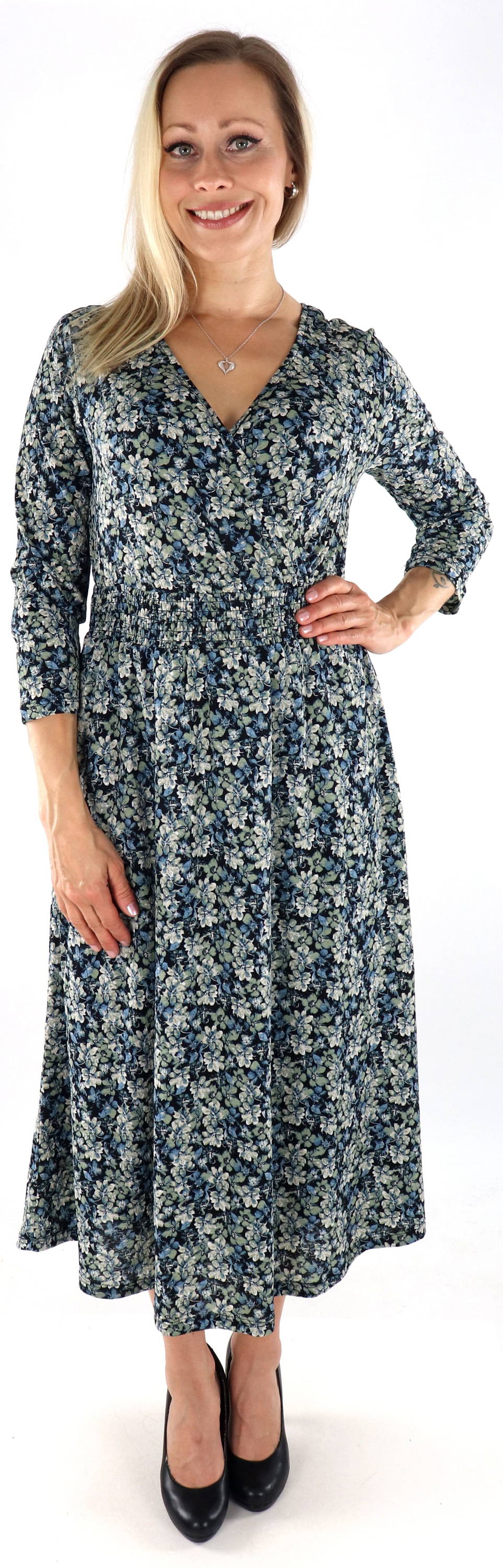 Kreppikankainen kaunis mekko V-pääntiellä.