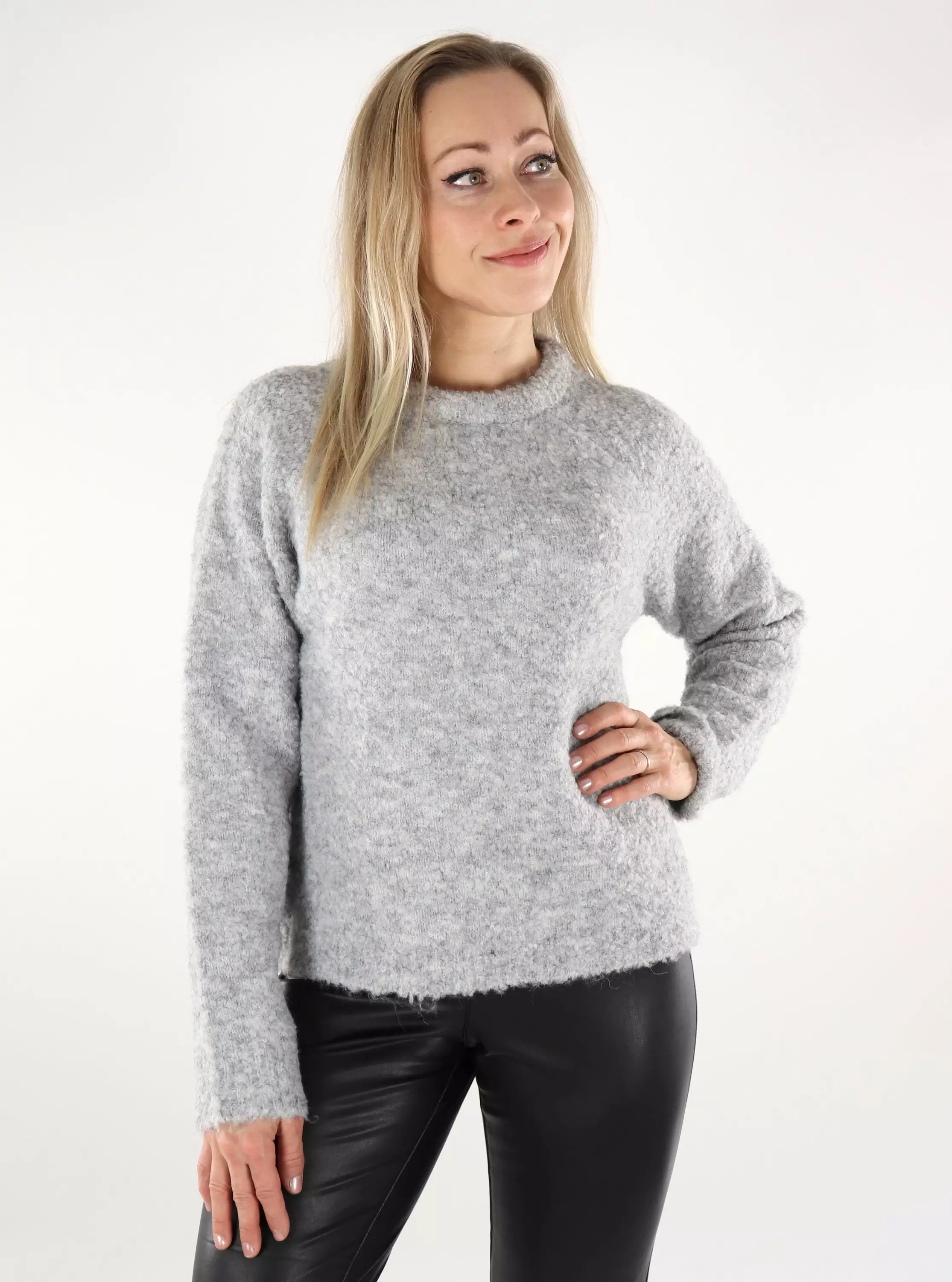 Pehmeä ja pörröinen neulepusero raglan-hihoilla.