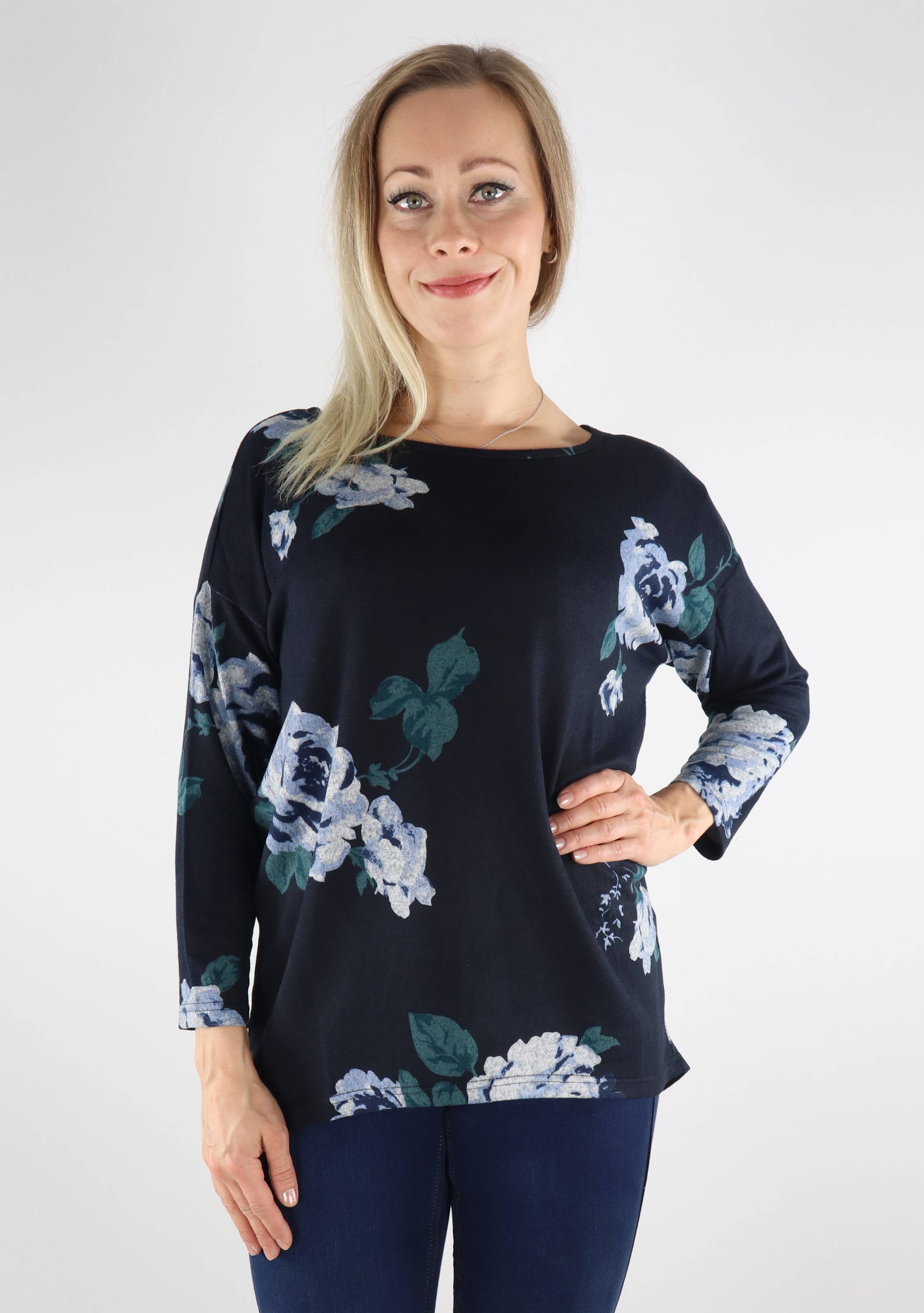 Pehmeä, kuvioitu neule, jossa on 3/4 -hihat ja pyöristetty, takaa pidempi helma
