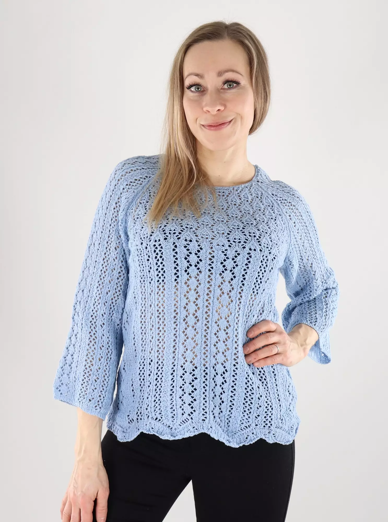 Kauniista pitsikuvioidusta neuloksesta valmistettu neulepusero. Helppo yhdistää niin farkkujen kuin hameiden kanssa!