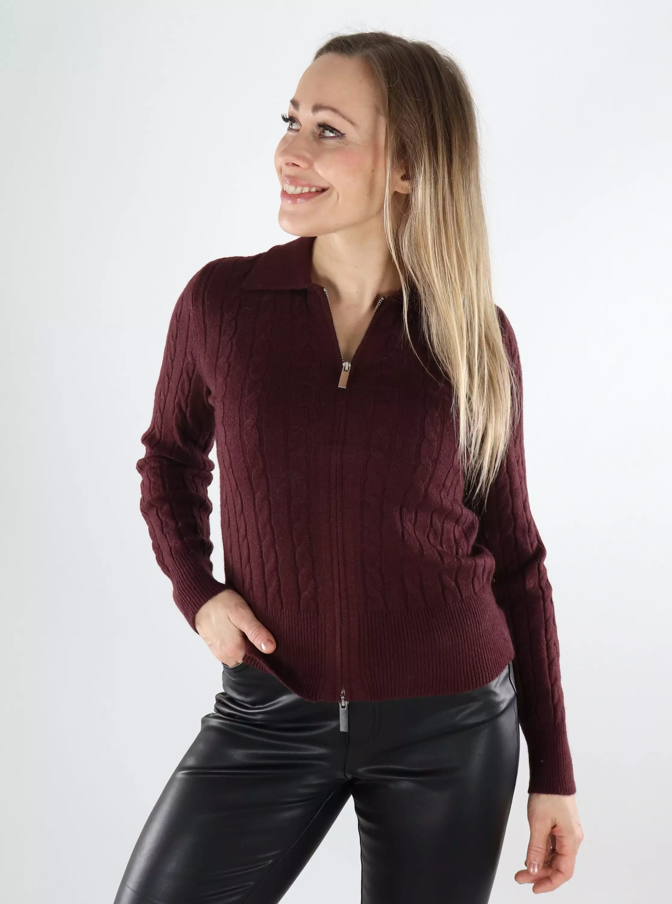 Only naisten neuletakki Katia Cable Zip Polo ruskea/viininpunainen