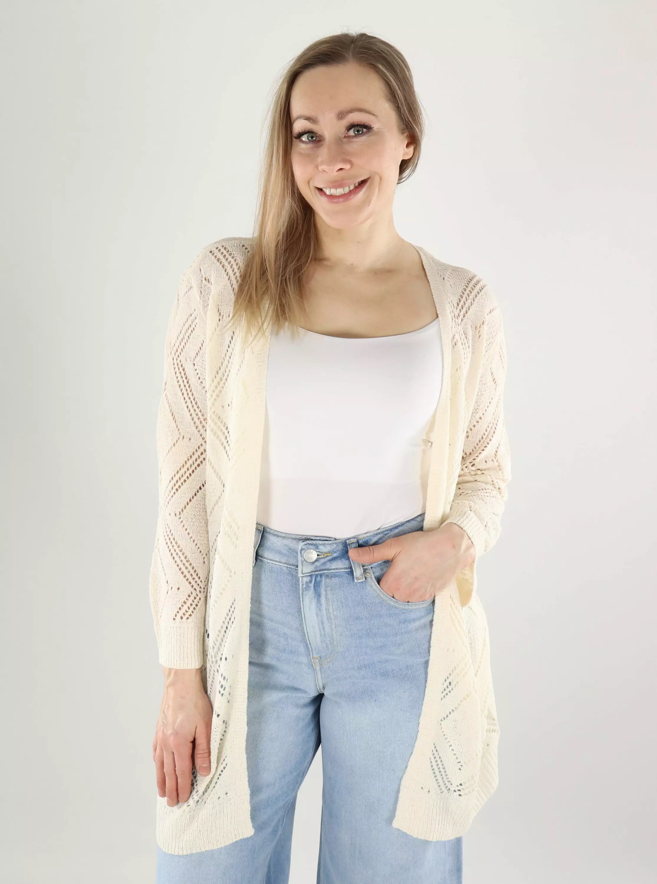 Onlyn kevyt, pitsikuvioitu neulekimono tuo asuusi ripauksen boheemia tyyliä! Rento malli, joka toimii loistavasti niin arjessa kuin vapaa-ajalla.