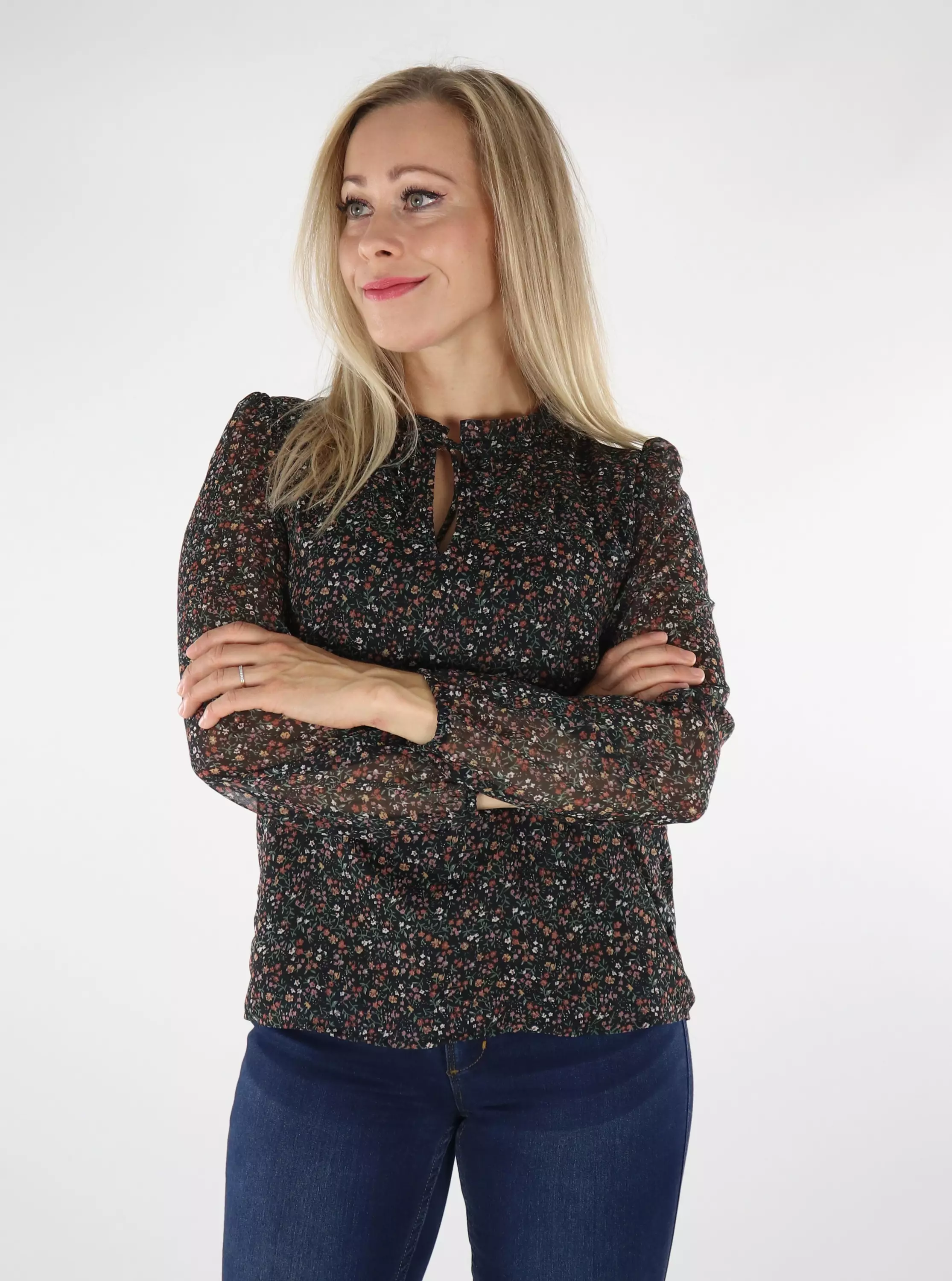Kukkakuosinen läpikuultava paita rypytyksillä ja trikoovuorella.