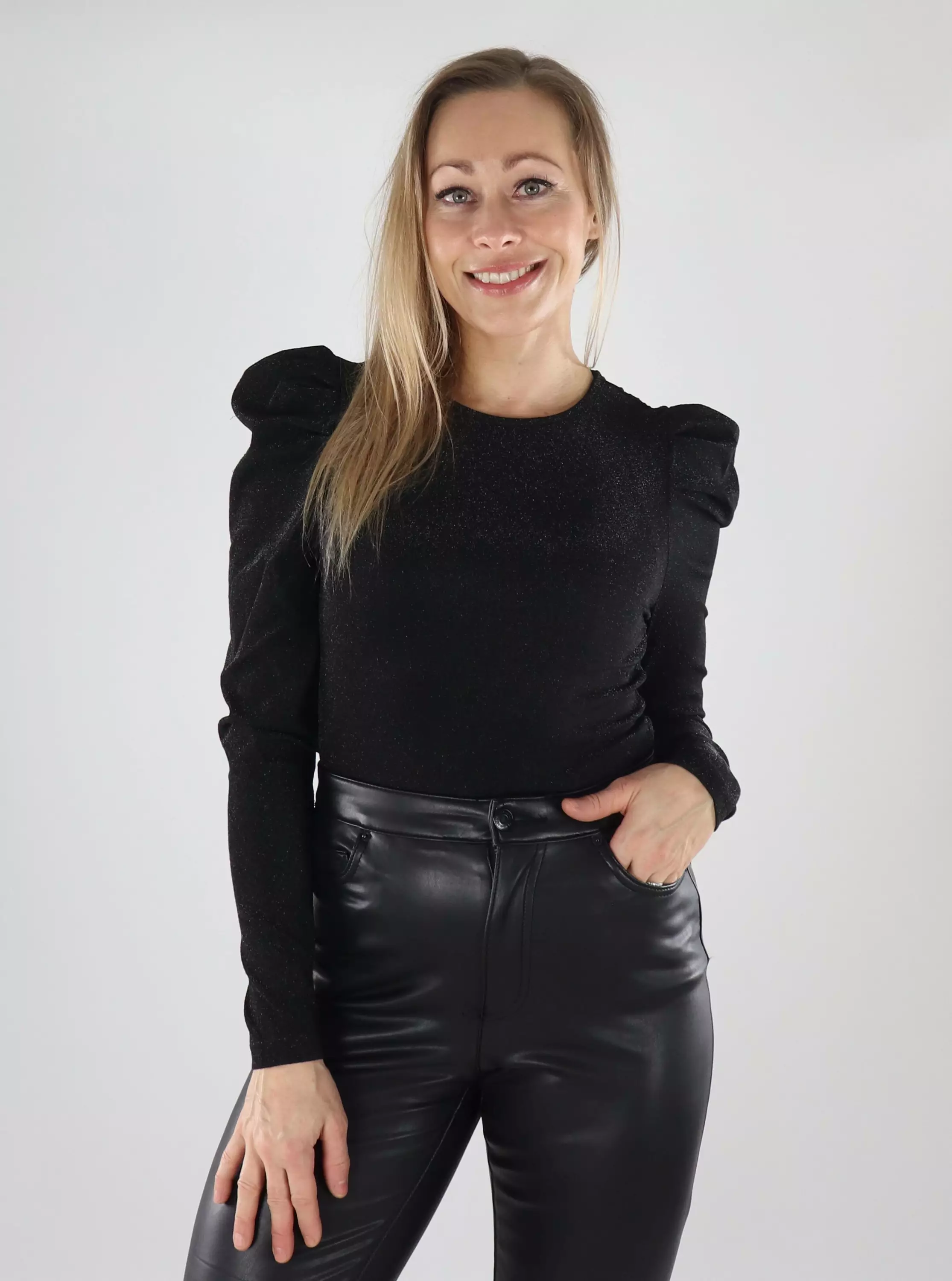 Näyttävä vartalonmyötäinen glitterpaita, jossa rypytykset olkapäissä.