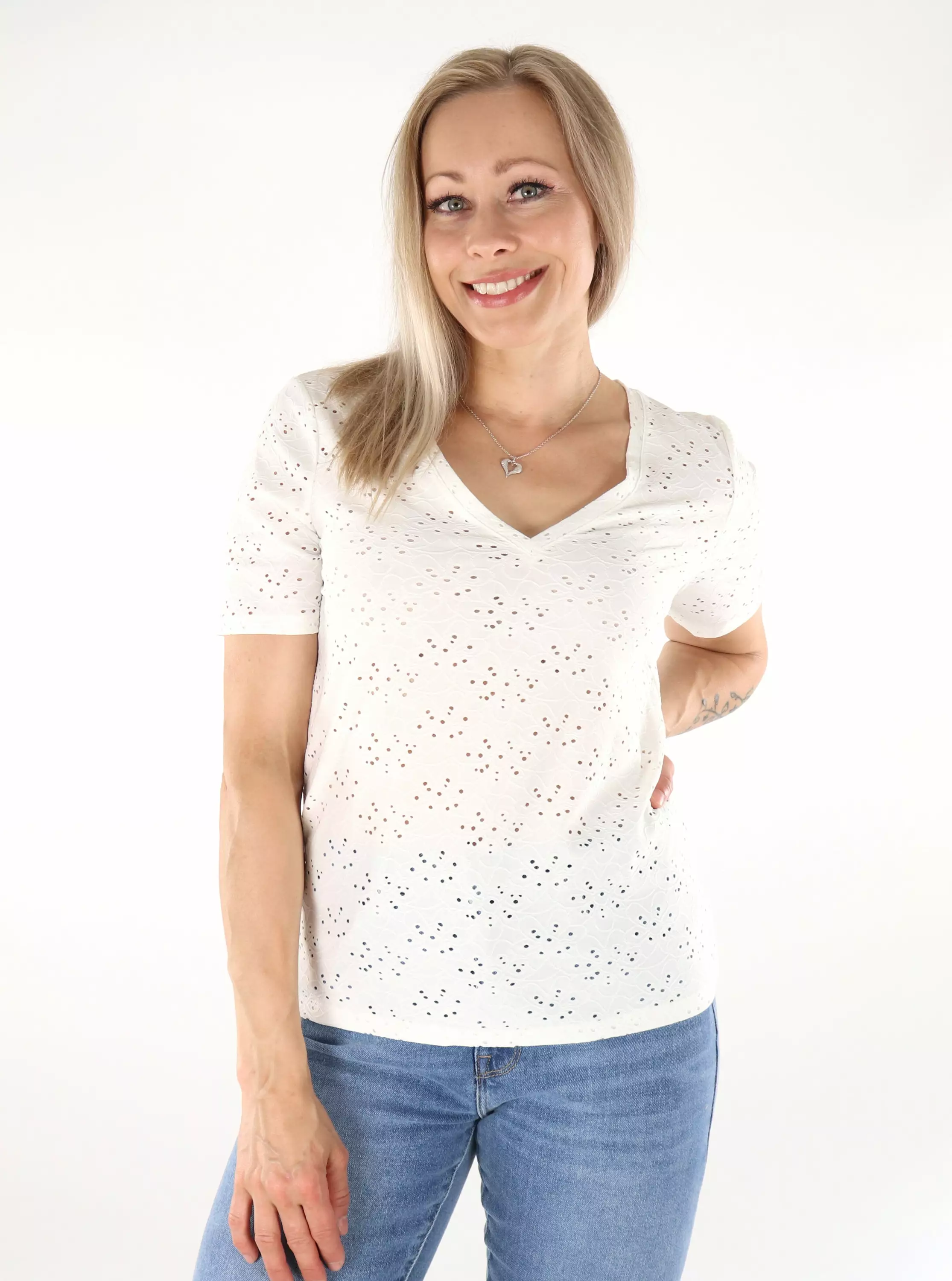 Naisten reikäkuvioitu, joustava t-paita V-pääntiellä.