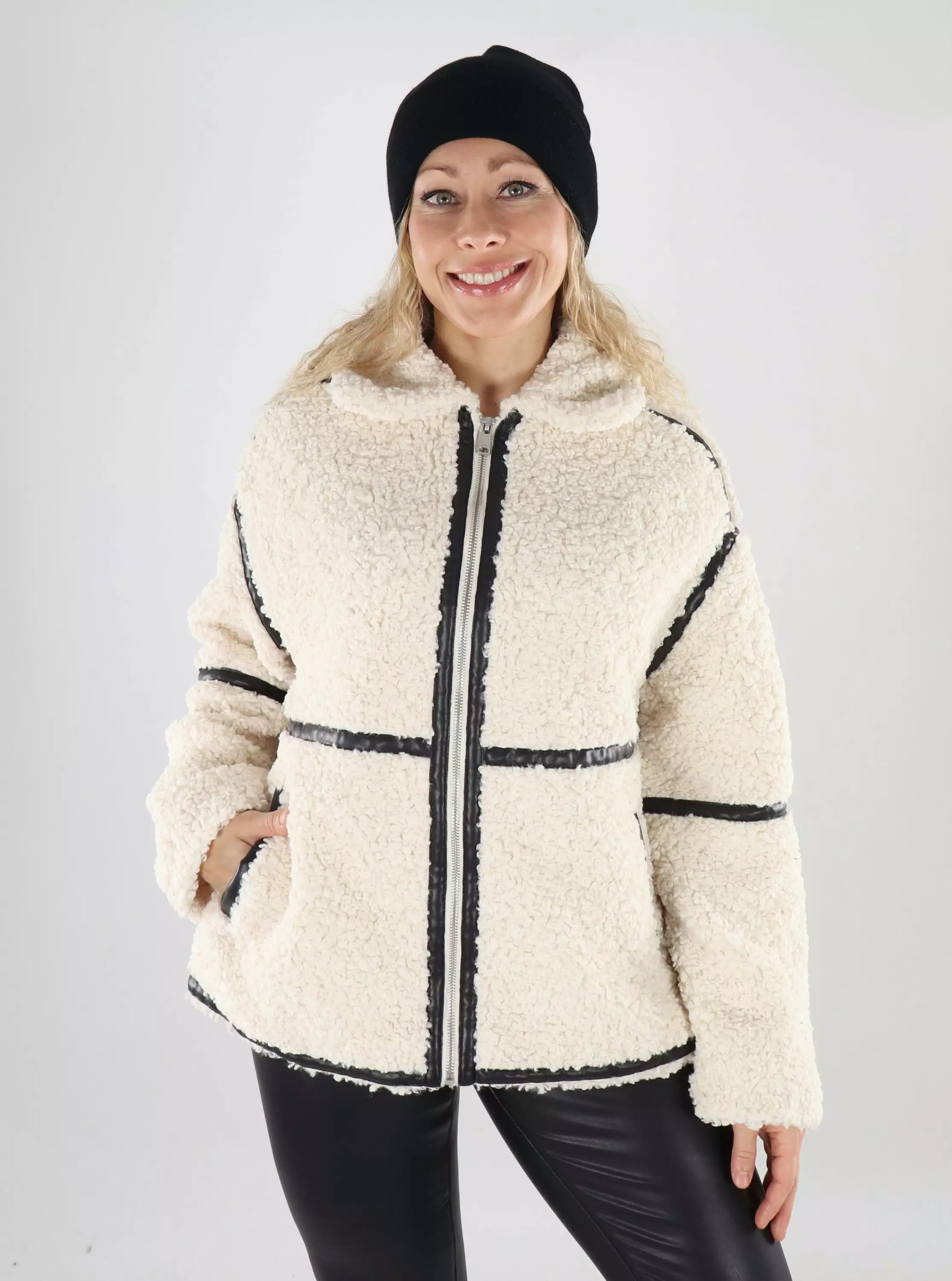 Tämä pehmeä teddy-takki tuo asuun lämpöä ja trendikkyyttä! Luonnonvalkoinen sävy on helppo yhdistää eri tyyleihin, ja sivutaskut lisäävät käytännöllisyyttä. Täydellinen valinta viileämpiin päiviin.