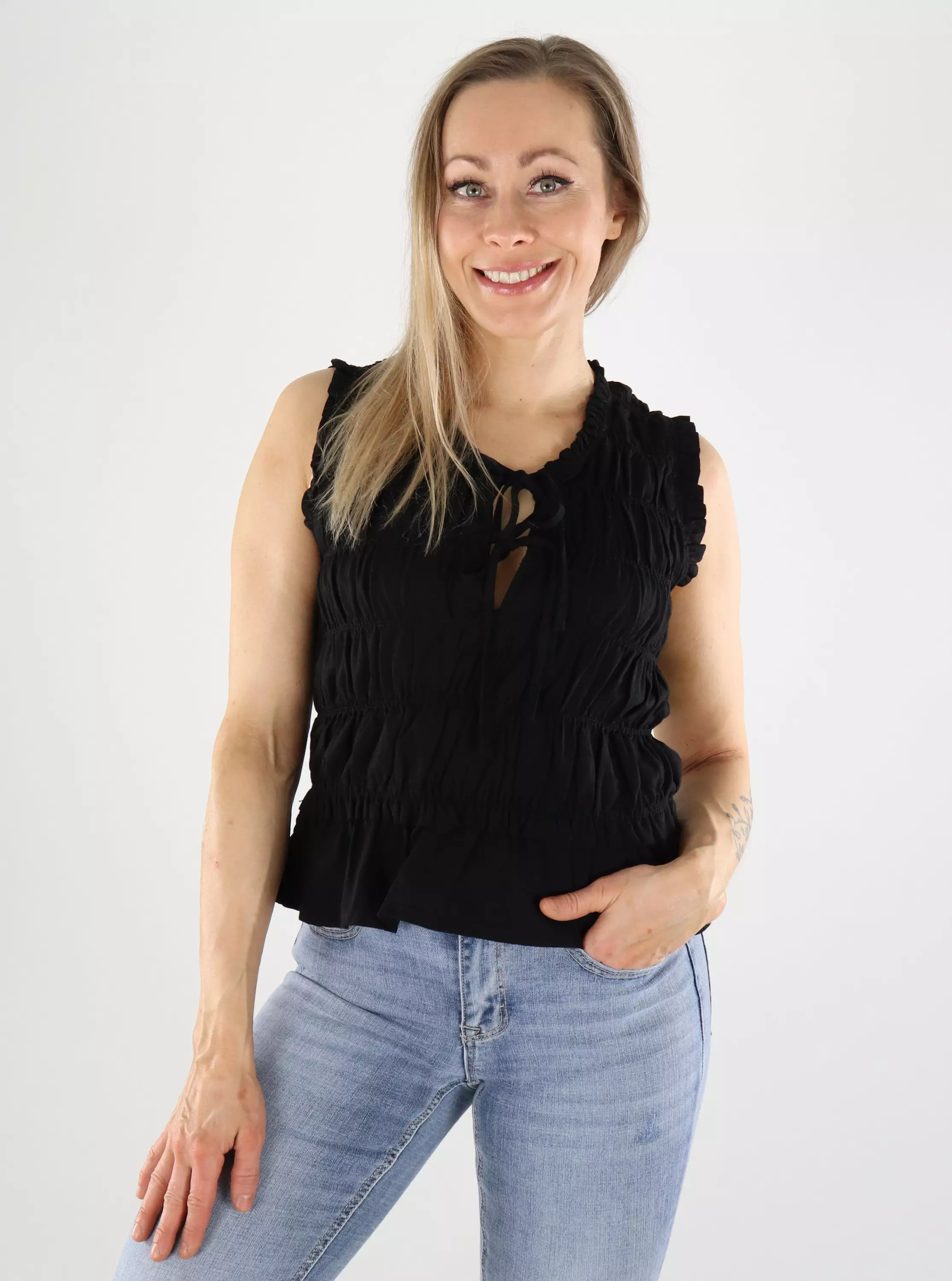 Luo pehmeä ja tyylikäs look tällä ONLY-frillatopilla. Topissa on kauniit poimutukset sekä edessä solmittavat nyörit.