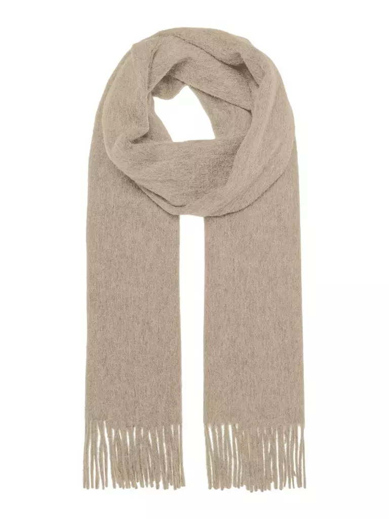 100% lampaan villasta valmistettu huivi, jonka päissä hapsut.