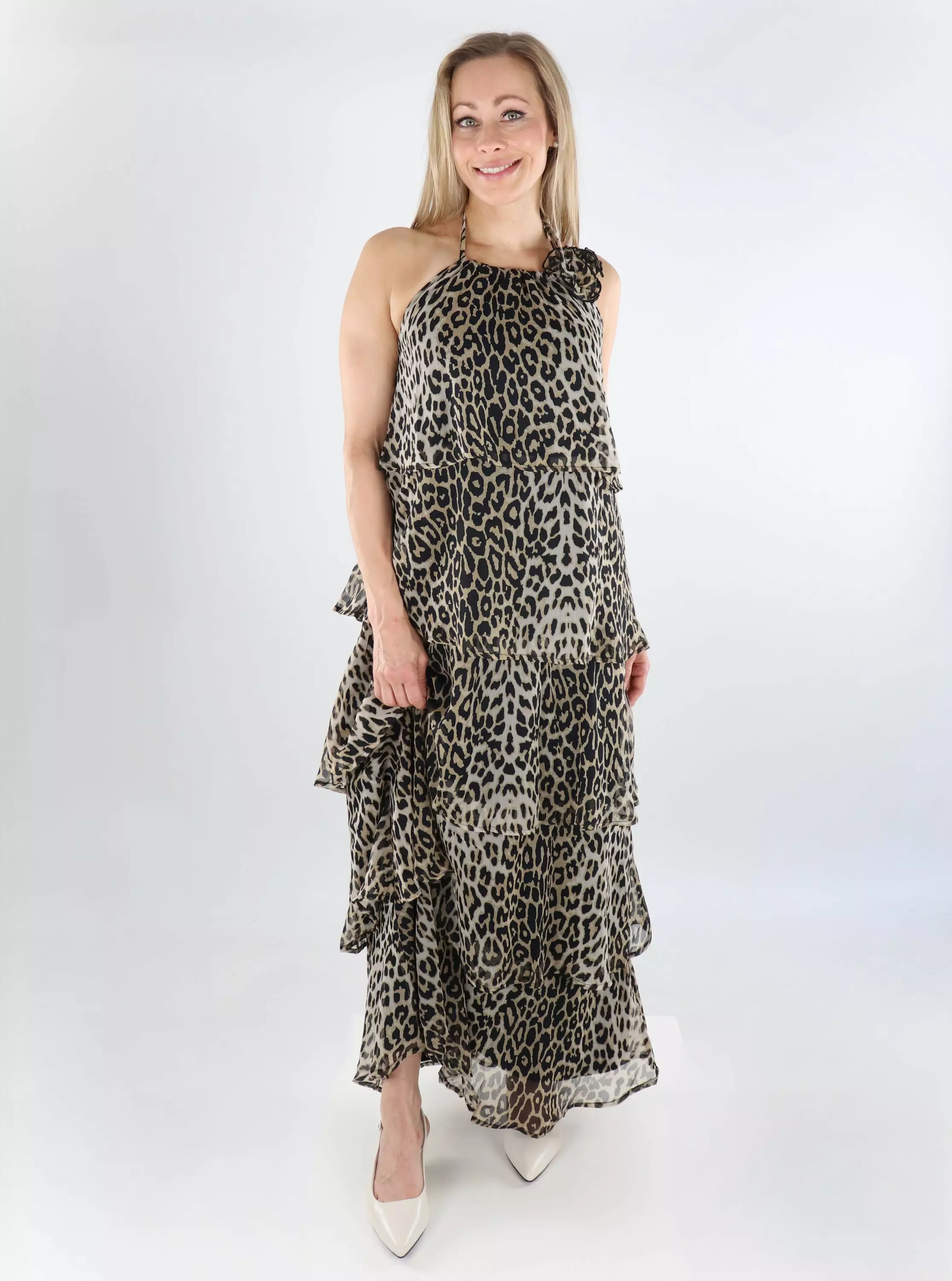 Piecesin leopardikuosinen pitkä mekko, jonka kerrostettu frillahelma luo kevyen ja näyttävän ilmeen. Pääntien kukkayksityiskohta viimeistelee mekon tyylikkäästi!