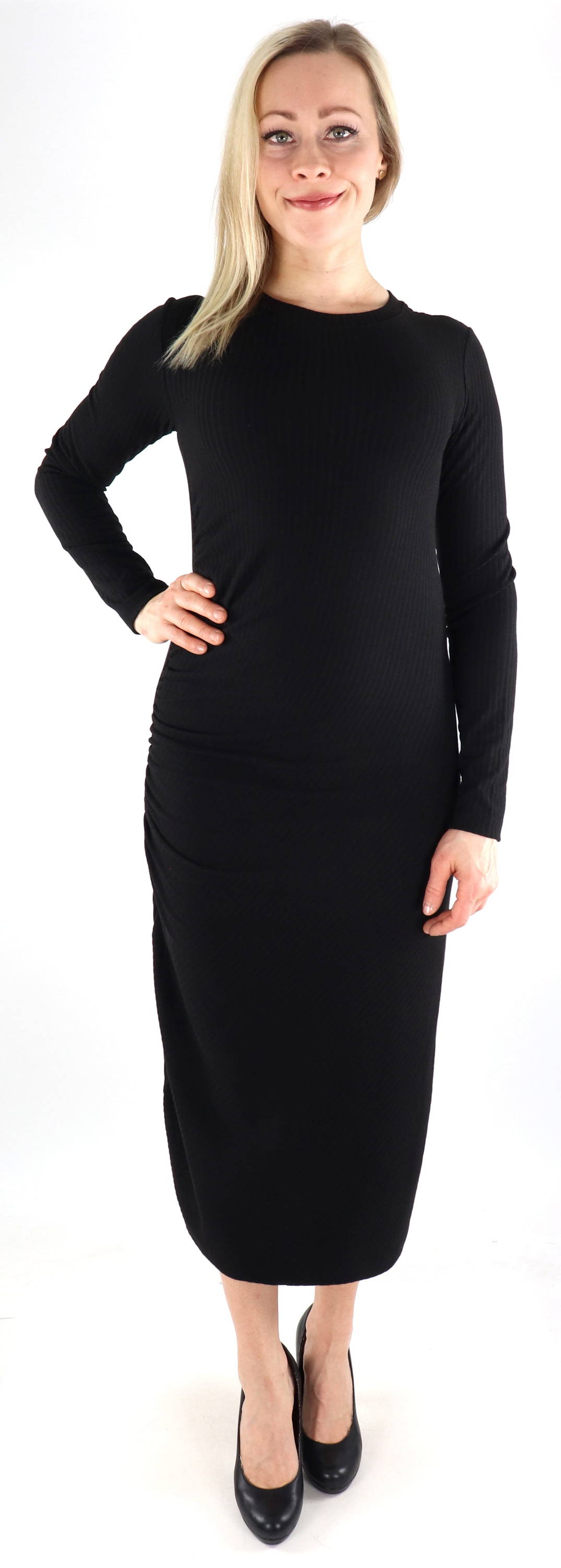 Vartalonmyötäinen mekko toispuoleisella rypytyksellä.