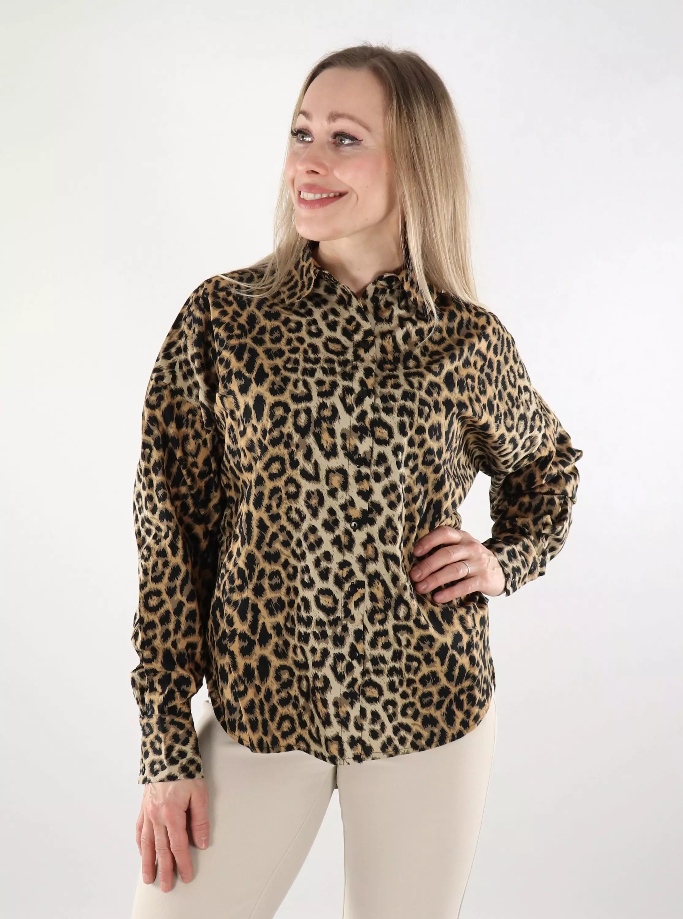 Leopardikuosinen, rennosti istuva kauluspaita jossa pyöristetty ja hieman takaa pidempi helma.