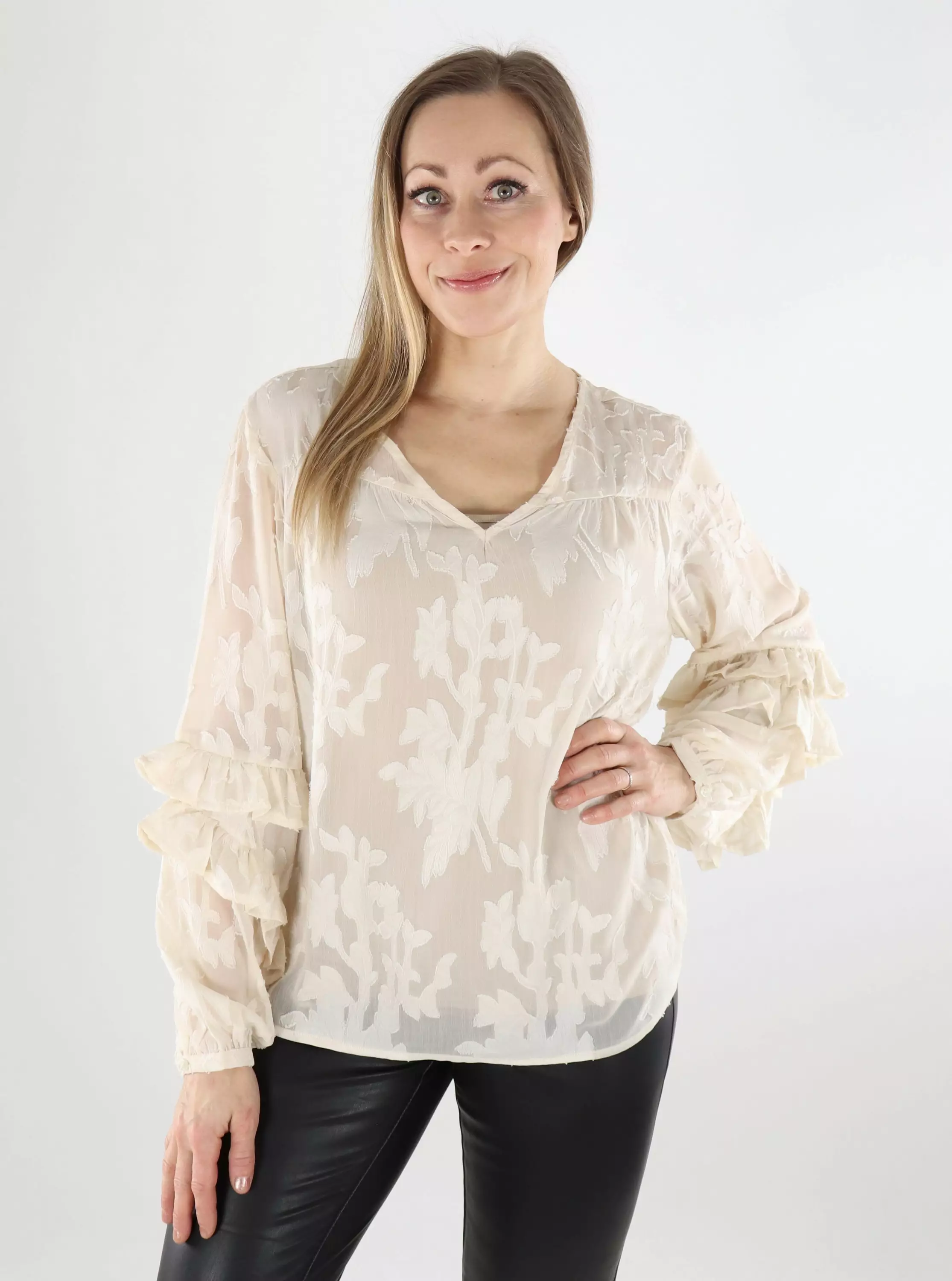 Piecesin läpikuultava paita kukkakuosilla ja naisellisella V-pääntiellä. Sopii hyvin sekä arkeen että juhlaan!