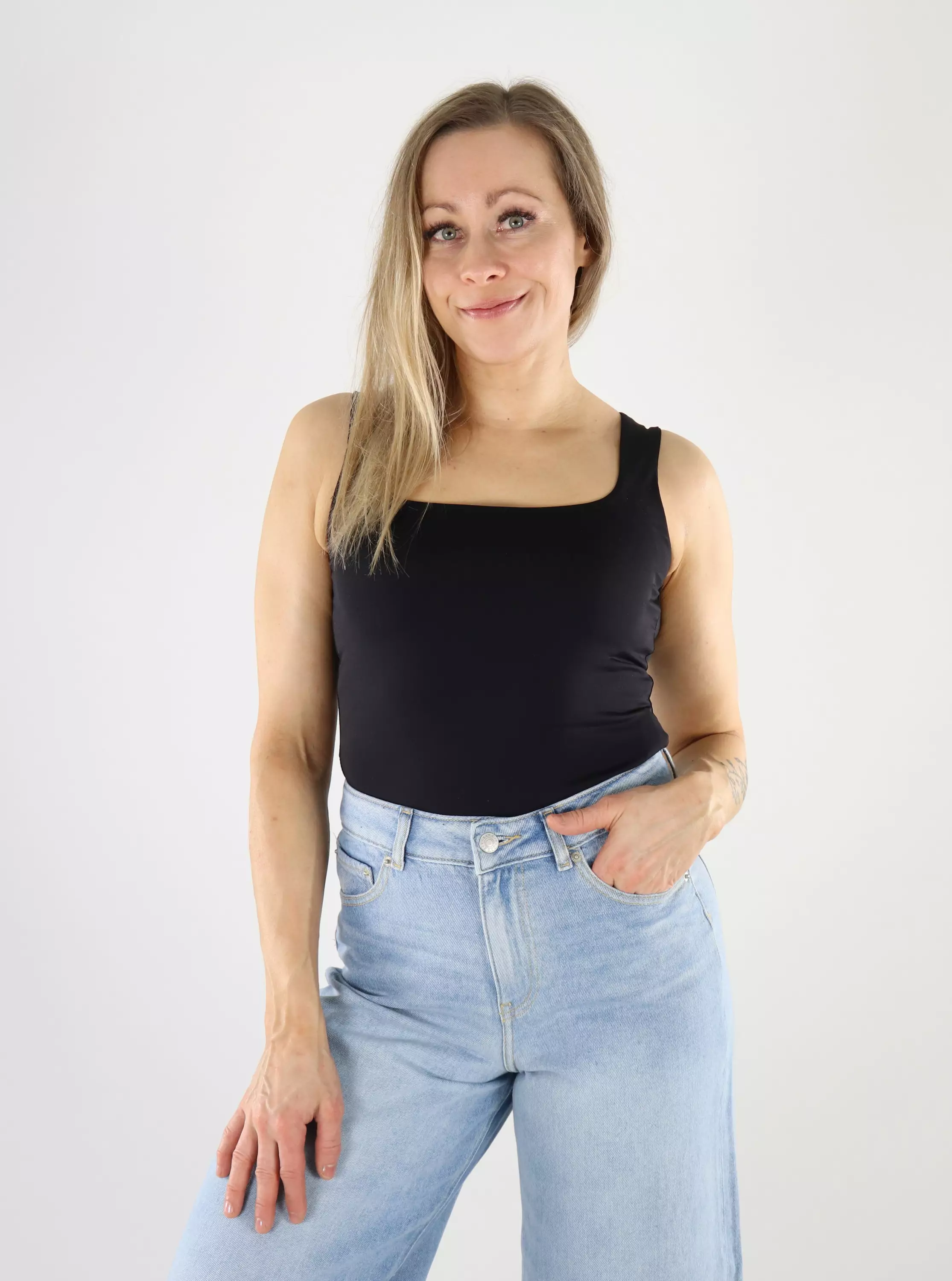 Pehmeästä ja joustavasta materiaalista valmistettu toppi, joka tuntuu miellyttävältä iholla.