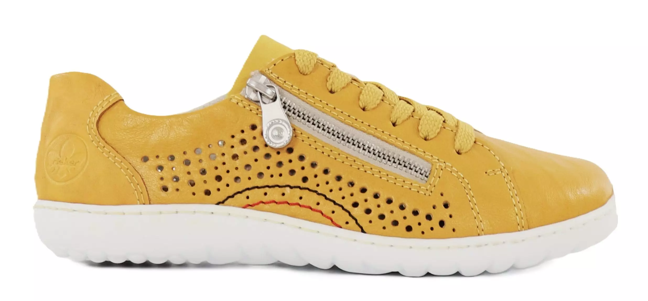 Riekerin aitonahkaiset paljasjalkatennarit tarjoavat luonnollisen ja kevyen kävelykokemuksen. Aito nahka takaa kestävyyden ja hengittävyyden, kun taas paljasjalkakengän rakenne tukee jalkasi luonnollista liikettä. Keltainen väri tuo raikkautta, ja kätevä sivuvetoketju helpottaa pukemista.