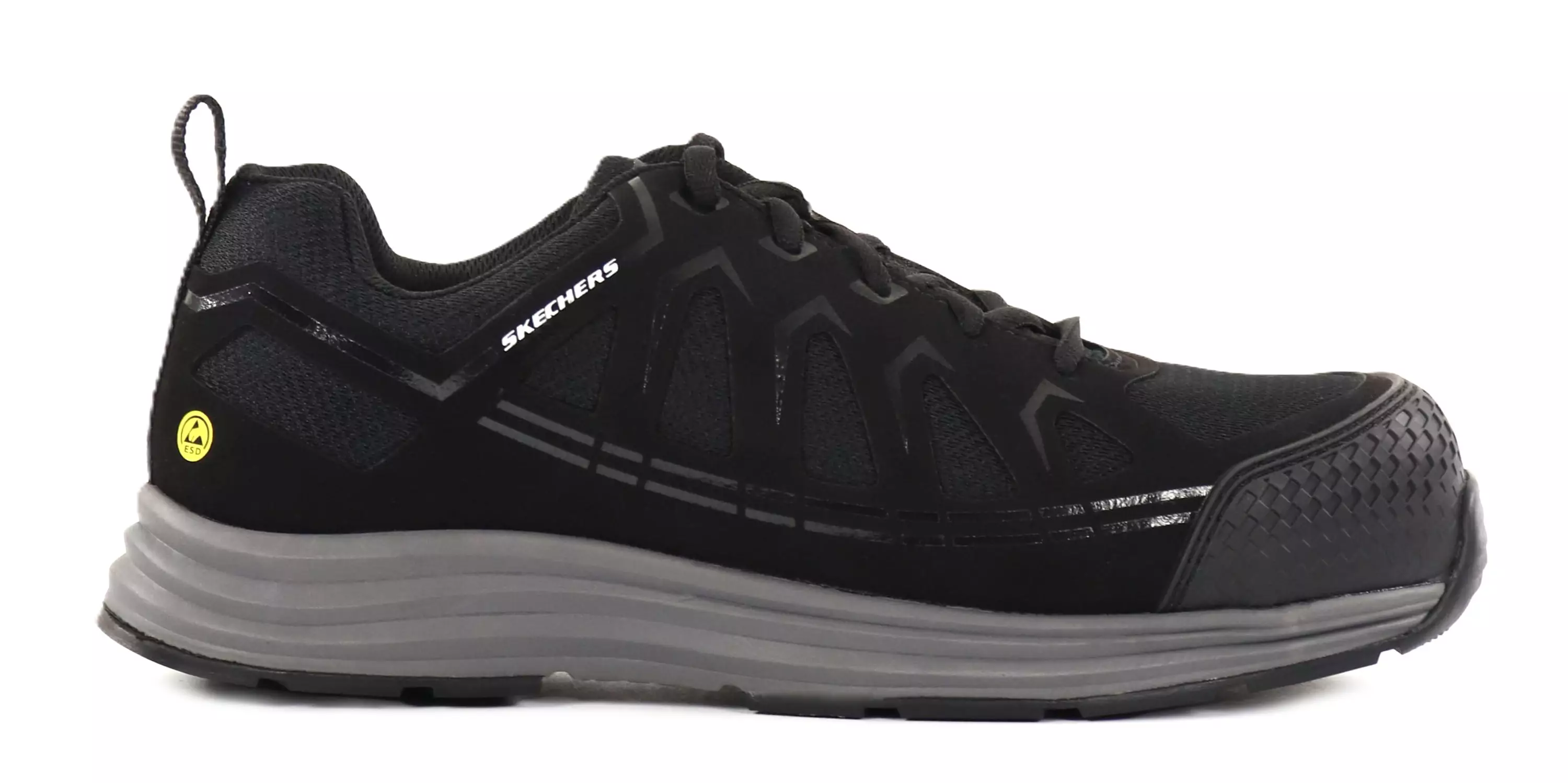 Skechersin kevyt ja urheilullinen turvajalkine, jossa on hengittävä päällinen sekä komposiittivarvassuoja. ESD-rakenne ehkäisee staattisen sähkön kertymistä, ja metallivapaa läpäisysuoja lisää turvallisuutta. Mukavuutta askellukseen tuo iskunvaimentava Hi-Poly-sisäpohja.