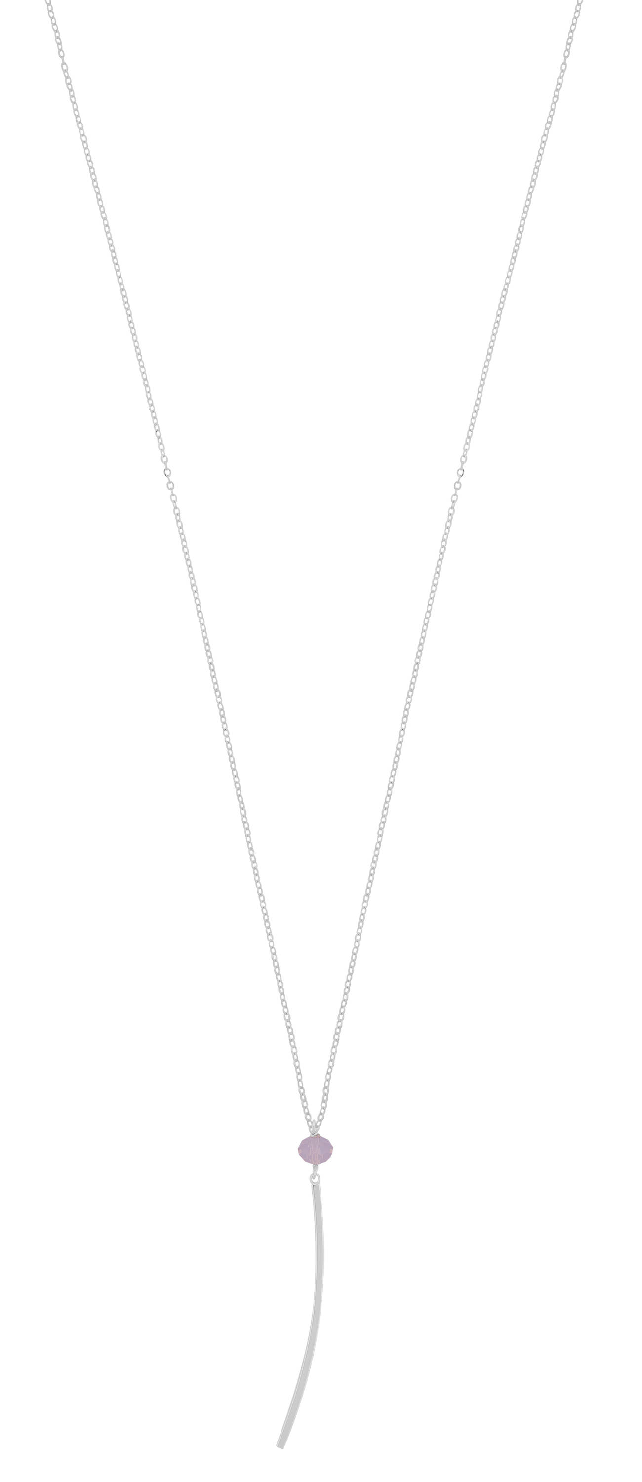 Kaunis kaulakoru, jossa valkoinen tai pinkki helmi ja kapea hopealaatta riipuksena.