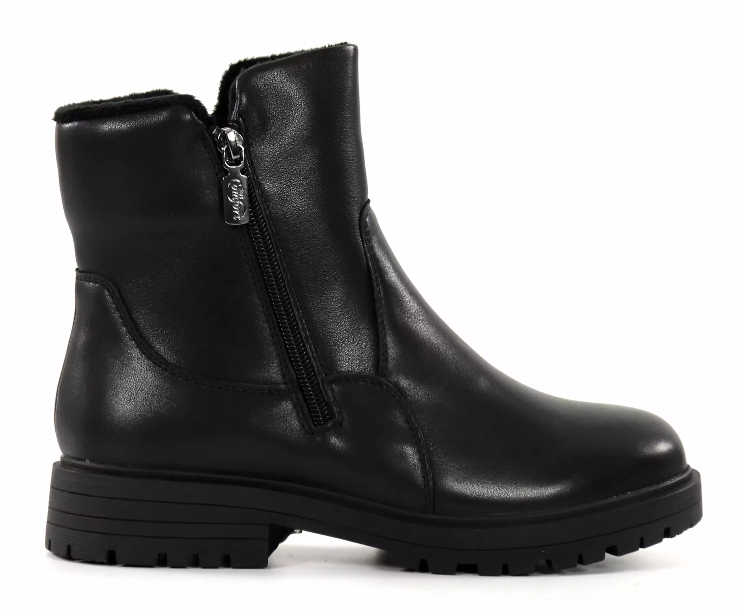 Nahkaiset nilkkurit, joiden pohjassa käännettävät liukuesteet. Molemminpuoliset vetoketjut tekevät kenkien pukemisesta helppoa!