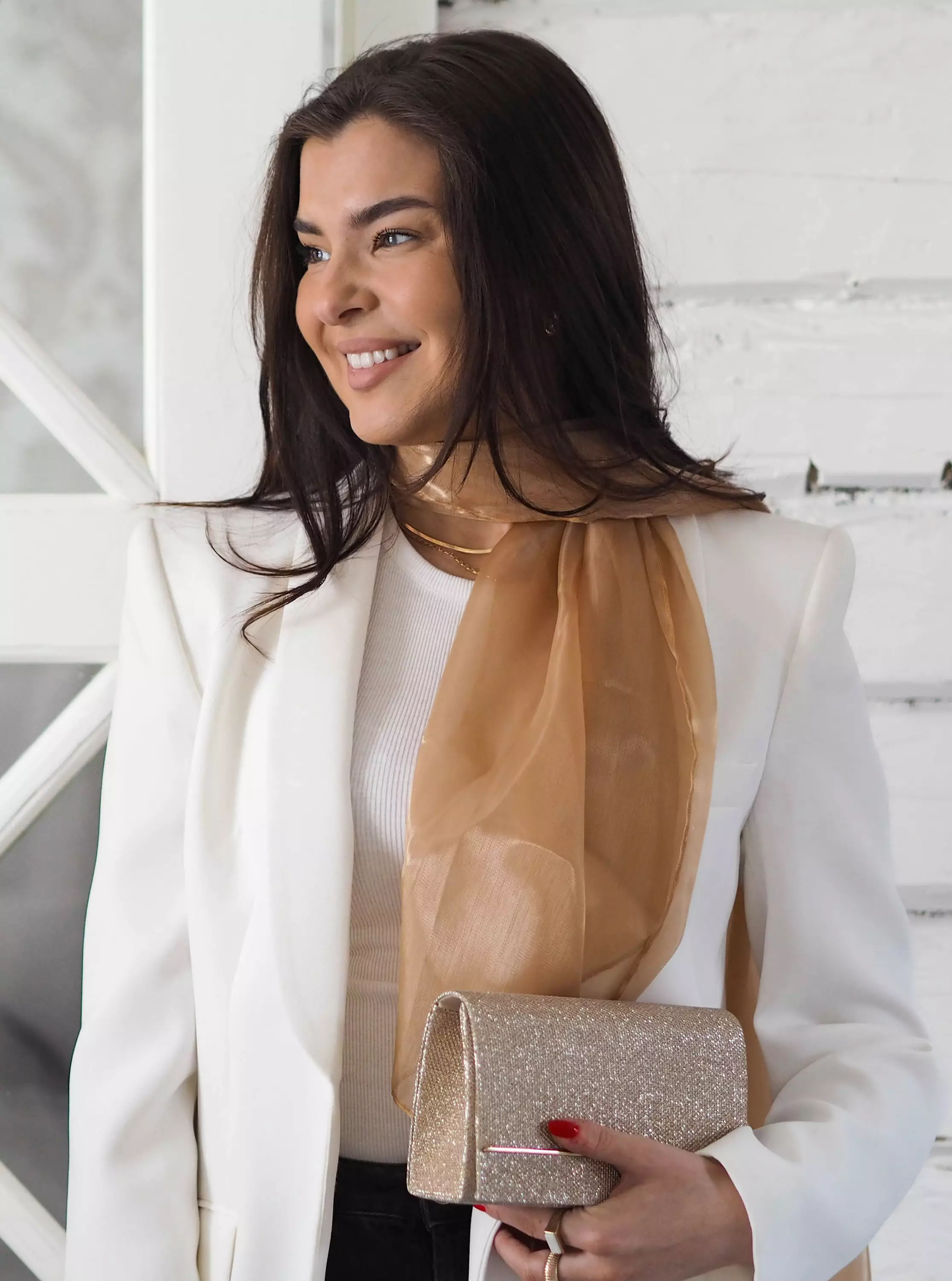 Venizin kultainen sifonkihuivi on täydellinen valinta juhla-asuihin. Kevyt ja kauniisti laskeutuva huivi sopii mainiosti hartiahuiviksi, lisäten hienostuneen ja naisellisen ilmeen juhlahetkiin.
