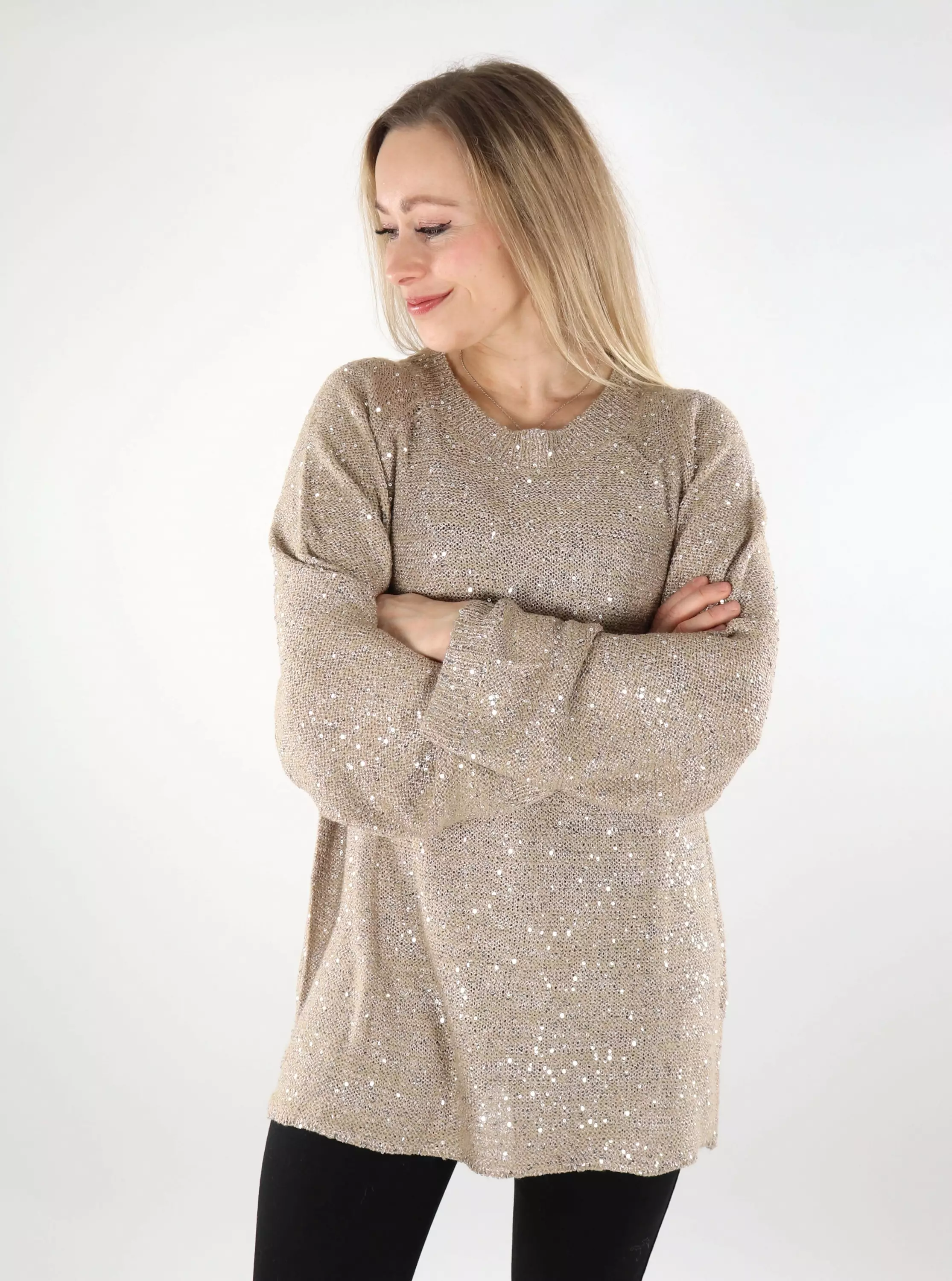 Upea pitkänmallinen neule kimaltelevilla paljeteilla. Neuleessa on tyylikkäät rennon malliset hihat.