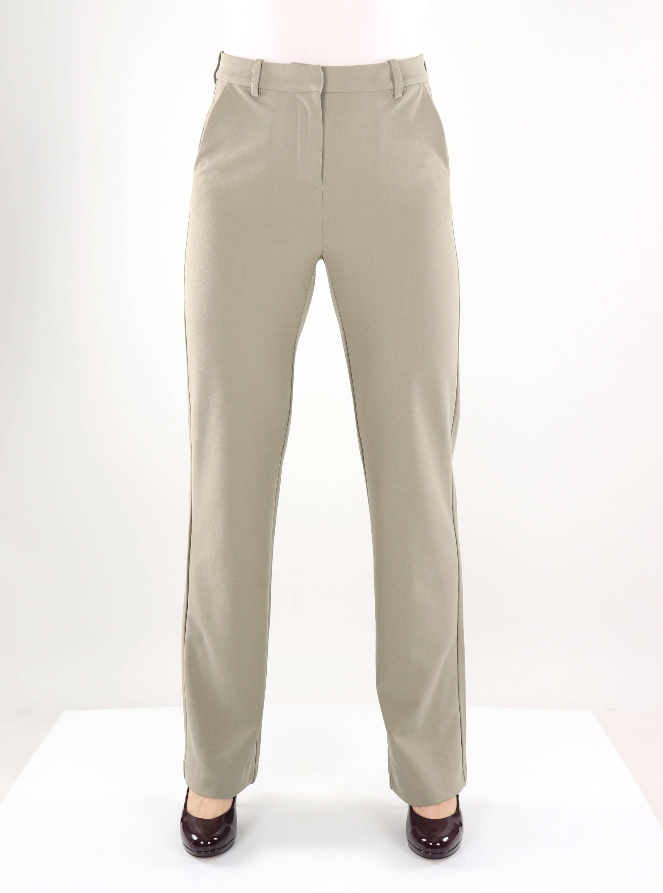 Suorat housut, joissa vyölenkit, vetoketju- ja hakaskiinnitys edessä, sivutaskut sekä strukturoitu kangas.