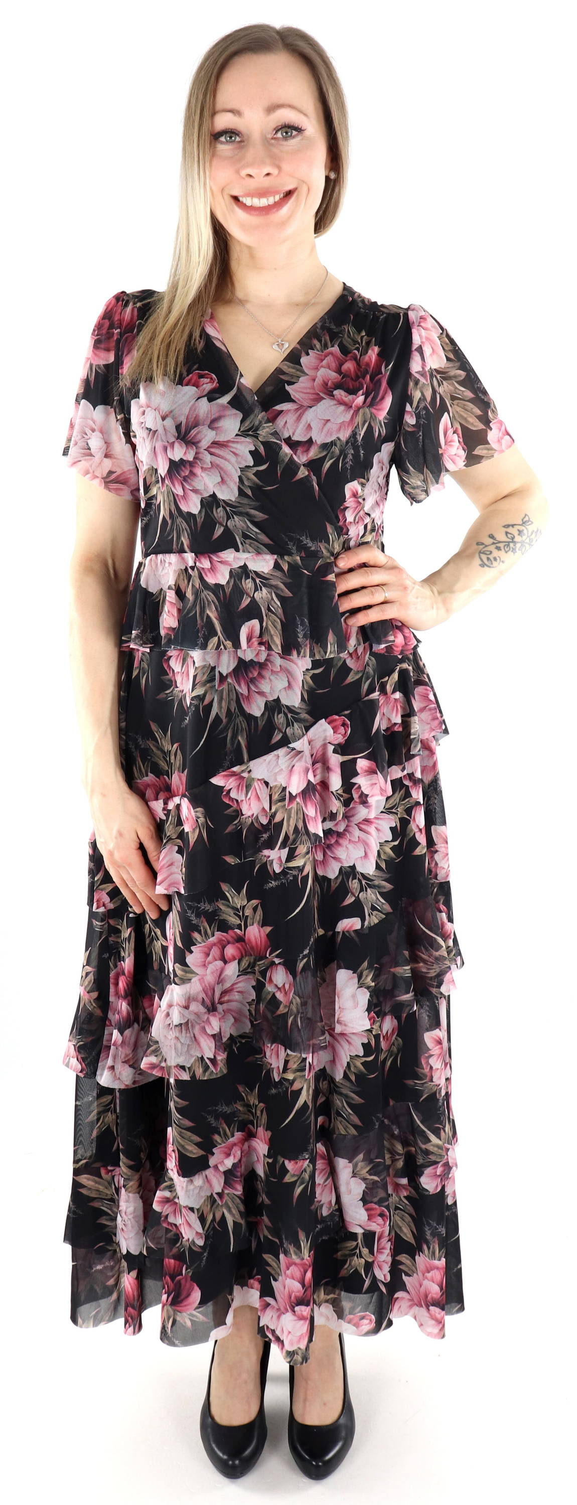 Kaunis röyhelöhelmainen mekko kukkakuosilla.