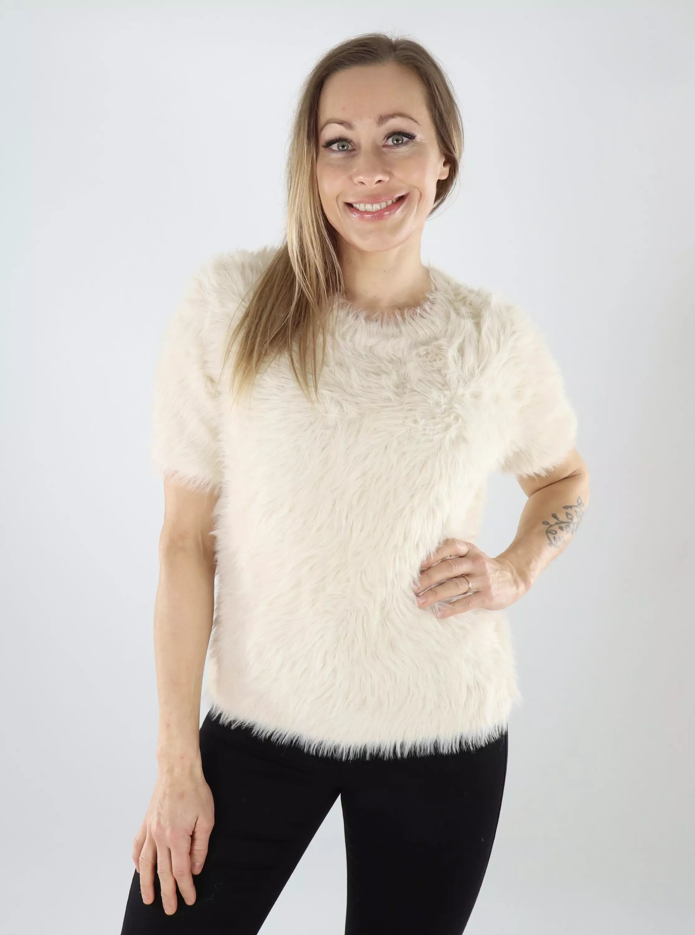 Vero Modan Fluffy-neule on nimensä mukaisesti pehmeä ja pörröisestä neuloksesta valmistettu. Lyhythihainen malli sopii hyvin myös kerrospukeutumiseen.